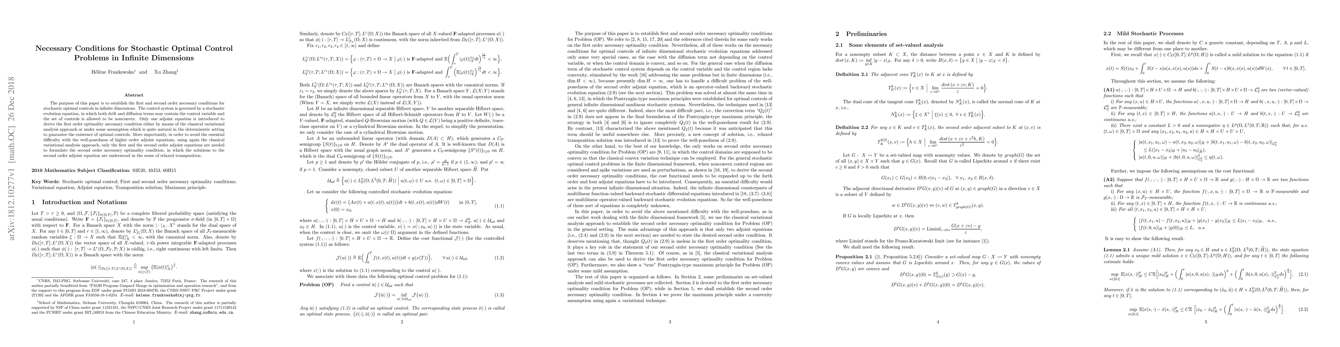 This paper establishes necessary conditions for stochastic optimal control problems in infinite dimensions, focusing on first and second order optimality conditions using classical variational analysis.