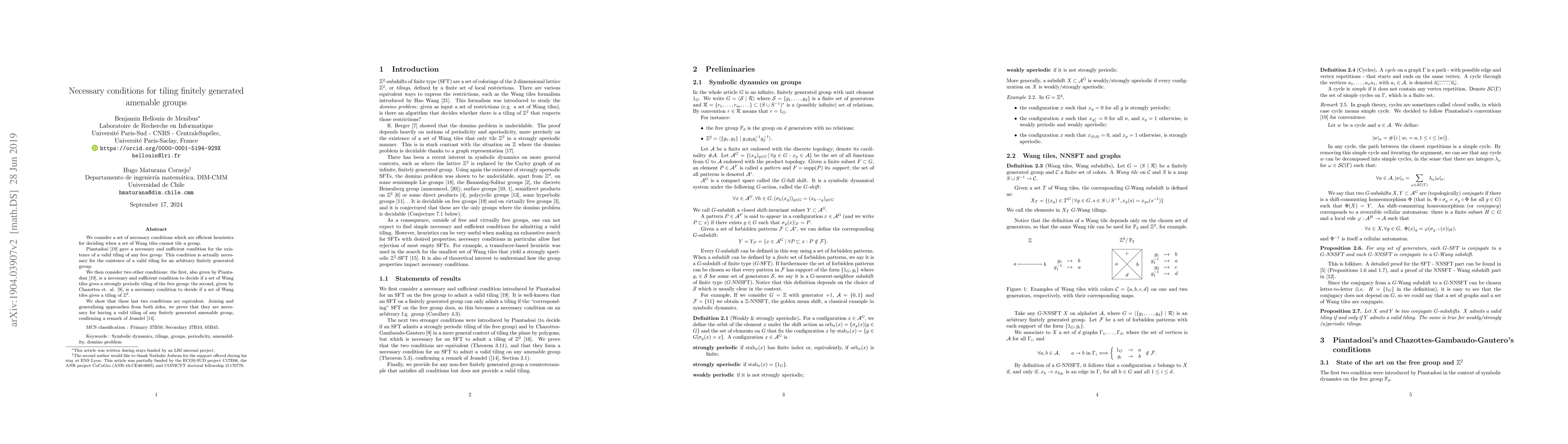 We consider a set of necessary conditions which are efficient heuristics for deciding when a set of Wang tiles cannot tile a group. Piantadosi gave a necessary and sufficient condition for the existence of a valid tiling of any free group. This condition is actually necessary for the existence of a valid tiling for an arbitrary finitely generated group. We then consider two other conditions: the first, also given by Piantadosi, is a necessary and sufficient condition to decide if a set of Wang tiles gives a strongly periodic tiling of the free group; the second, given by Chazottes et. al., is a necessary condition to decide if a set of Wang tiles gives a tiling of $\mathbb Z^2$. We show that these last two conditions are equivalent. Joining and generalising approaches from both sides, we prove that they are necessary for having a valid tiling of any finitely generated amenable group, confirming a remark of Jeandel.