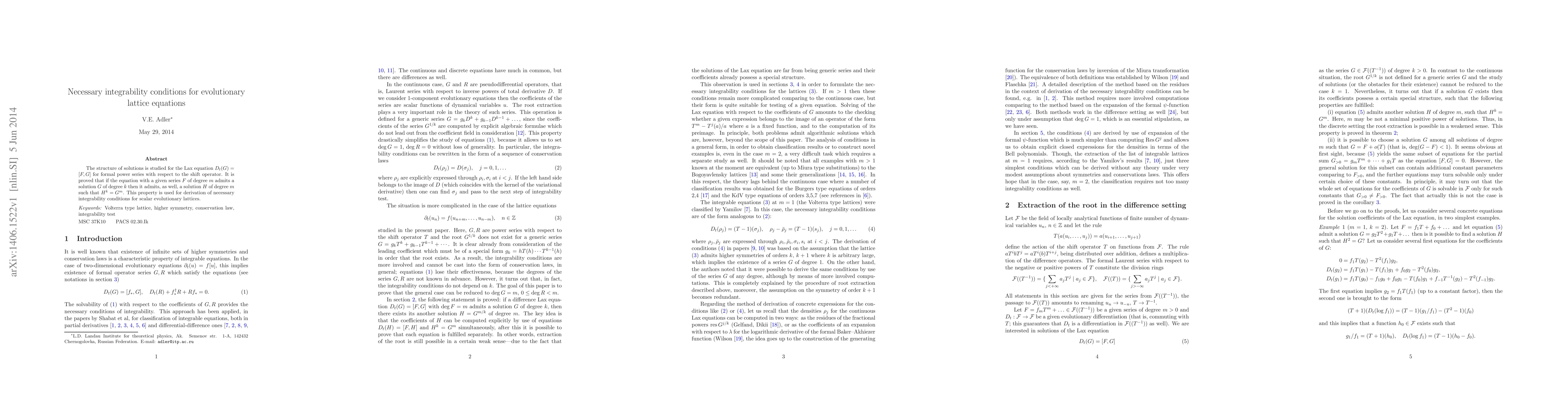 The structure of solutions is studied for the Lax equation $D_t(G)=[F,G]$ for formal power series with respect to the shift operator. It is proved that if the equation with a given series $F$ of degree $m$ admits a solution $G$ of degree $k$ then it admits, as well, a solution $H$ of degree $m$ such that $H^k=G^m$. This property is used for derivation of necessary integrability conditions for scalar evolutionary lattices.