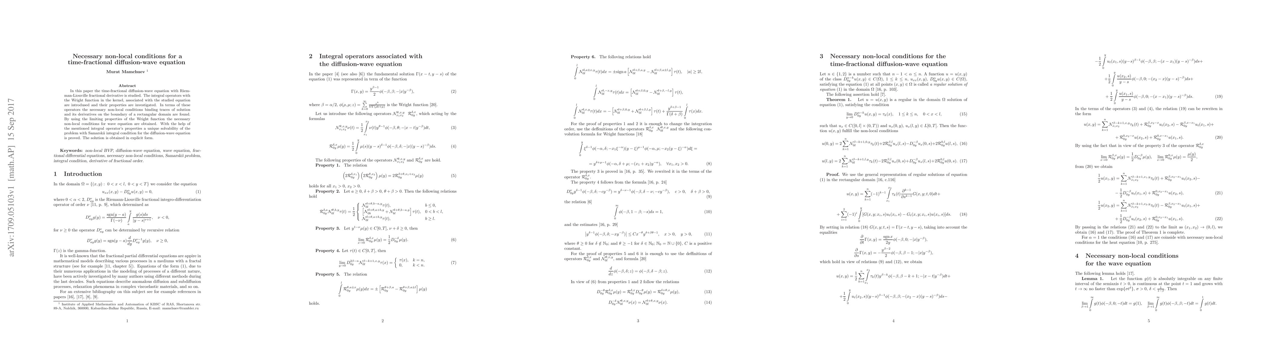 This paper investigates the time-fractional diffusion-wave equation using Riemann-Liouville fractional derivatives and integral operators with Wright functions. It establishes necessary non-local boundary conditions for the solution and proves unique solvability with Samarskii integral conditions, providing an explicit solution.