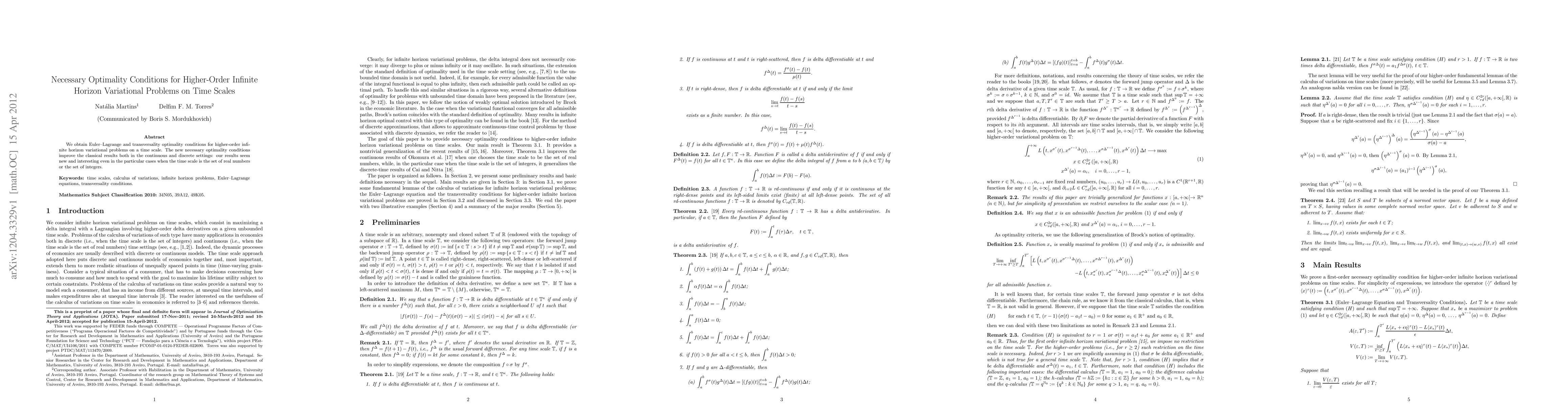 This paper establishes necessary optimality conditions for higher-order infinite horizon variational problems on time scales, improving classical results in both continuous and discrete settings. The new conditions are novel even when the time scale is the set of real numbers or integers.