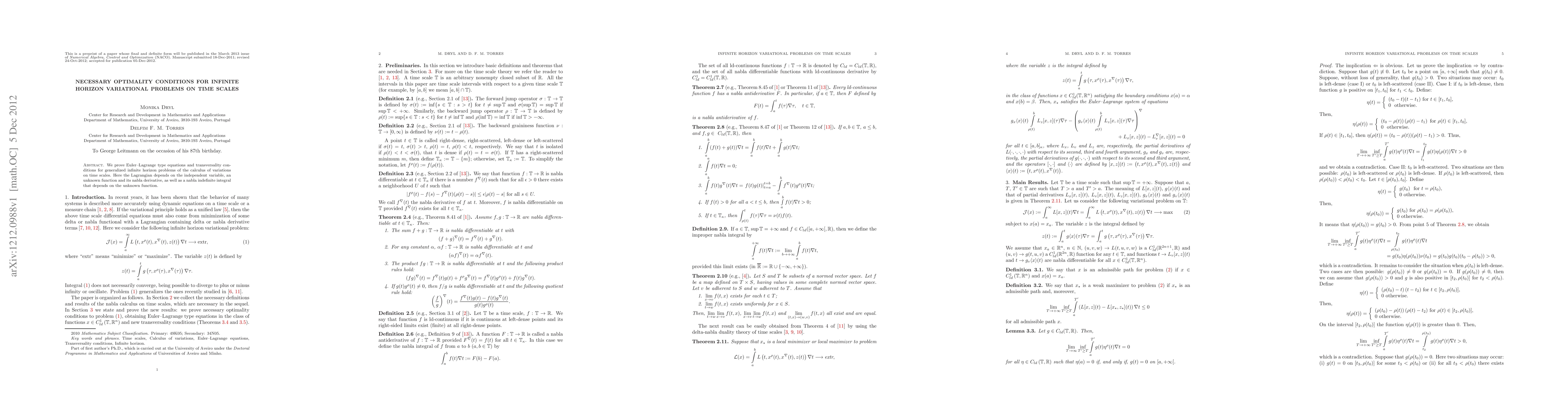 This paper establishes Euler-Lagrange equations and transversality conditions for generalized infinite horizon variational problems on time scales, where the Lagrangian incorporates the independent variable, the unknown function, its nabla derivative, and a nabla indefinite integral based on the unknown function.