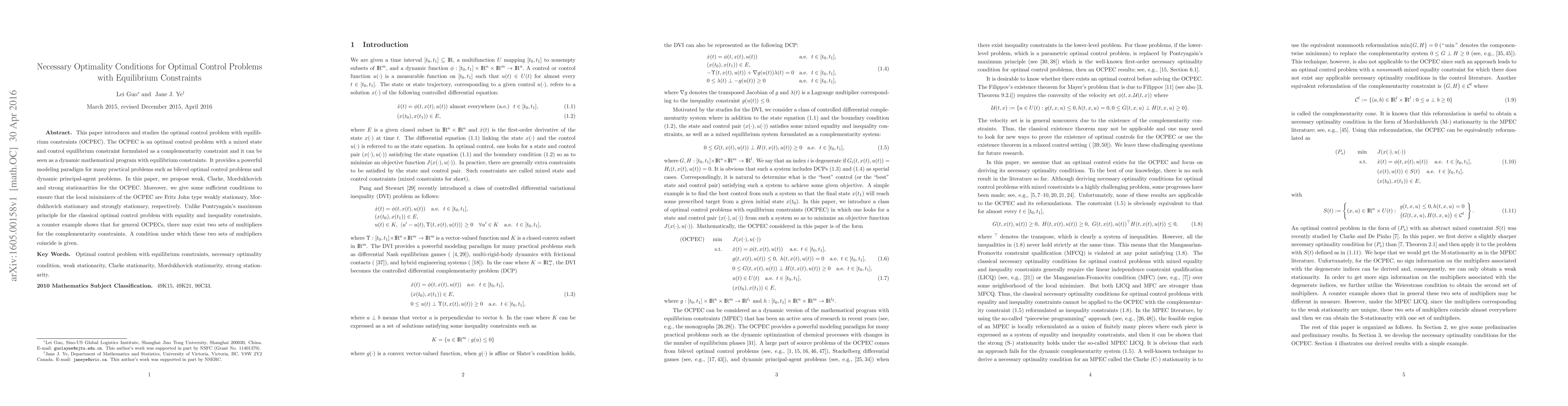 This paper develops necessary optimality conditions for optimal control problems with equilibrium constraints (OCPEC), proposing various stationarity concepts and sufficient conditions for local minimizers. It highlights that unlike classical optimal control problems, OCPECs may have distinct multiplier sets for complementarity constraints, with a condition ensuring their equivalence.
