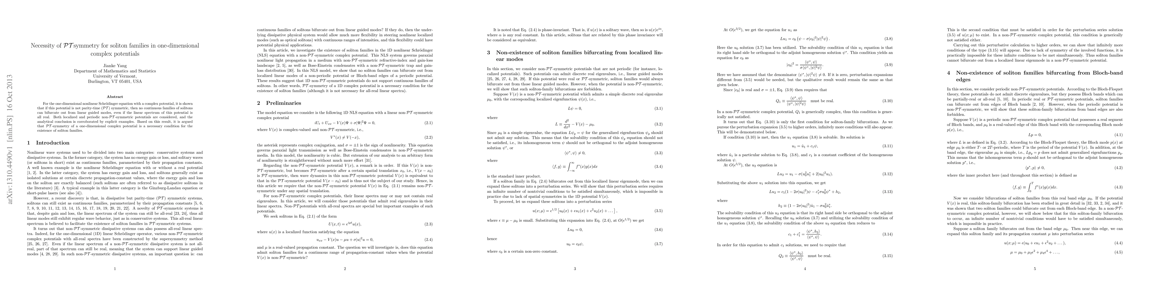 Summary: The research demonstrates that PT symmetry is essential for the existence of soliton families in one-dimensional complex potentials of the nonlinear Schrödinger equation. It concludes that non-PT-symmetric potentials cannot support continuous soliton bifurcations from linear guided modes, even with entirely real linear spectra.