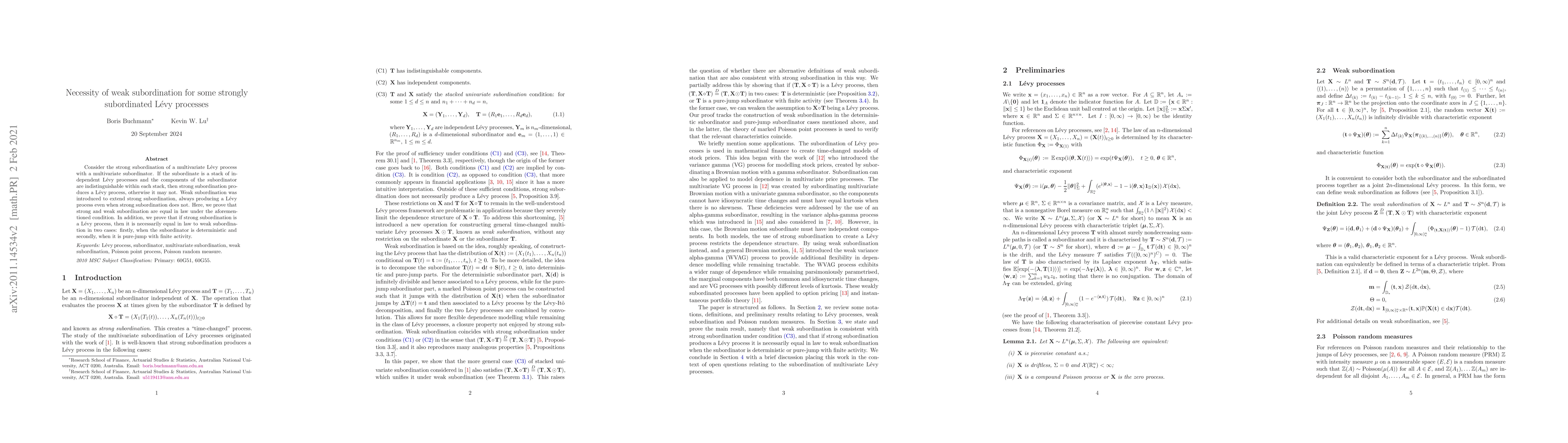 This paper investigates the equivalence of strong and weak subordination for multivariate Lévy processes under specific conditions. It proves that under the condition where components of the subordinator are indistinguishable within each stack, strong and weak subordination yield the same Lévy process. Additionally, it shows that if strong subordination results in a Lévy process, it must be equal in law to weak subordination when the subordinator is deterministic or pure-jump with finite activity.