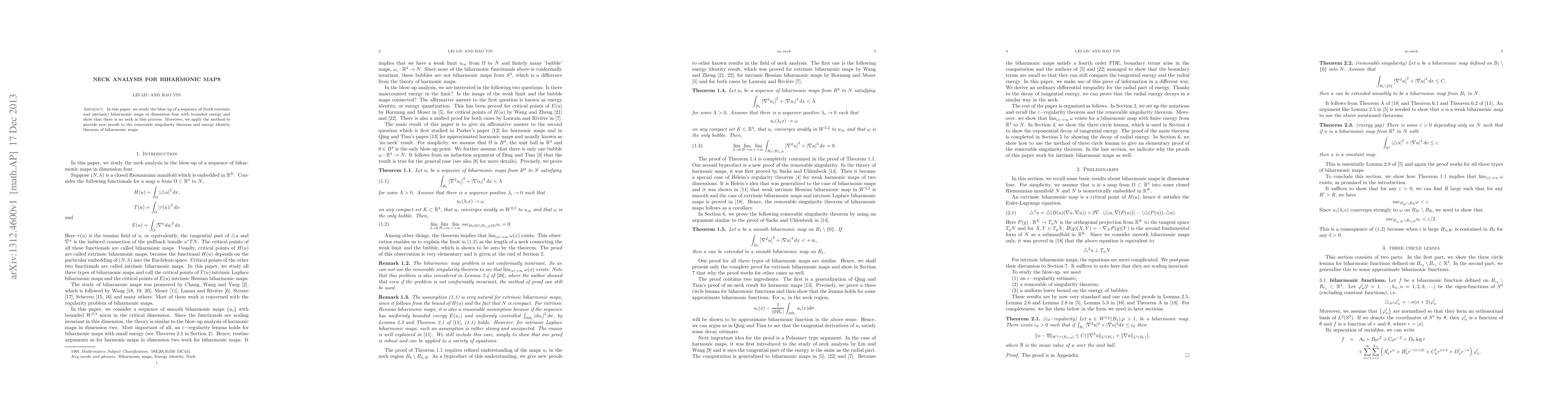 This paper investigates the blow-up behavior of biharmonic maps in dimension four with bounded energy, demonstrating the absence of neck formation. It also offers new proofs for the removable singularity theorem and energy identity theorem of biharmonic maps.