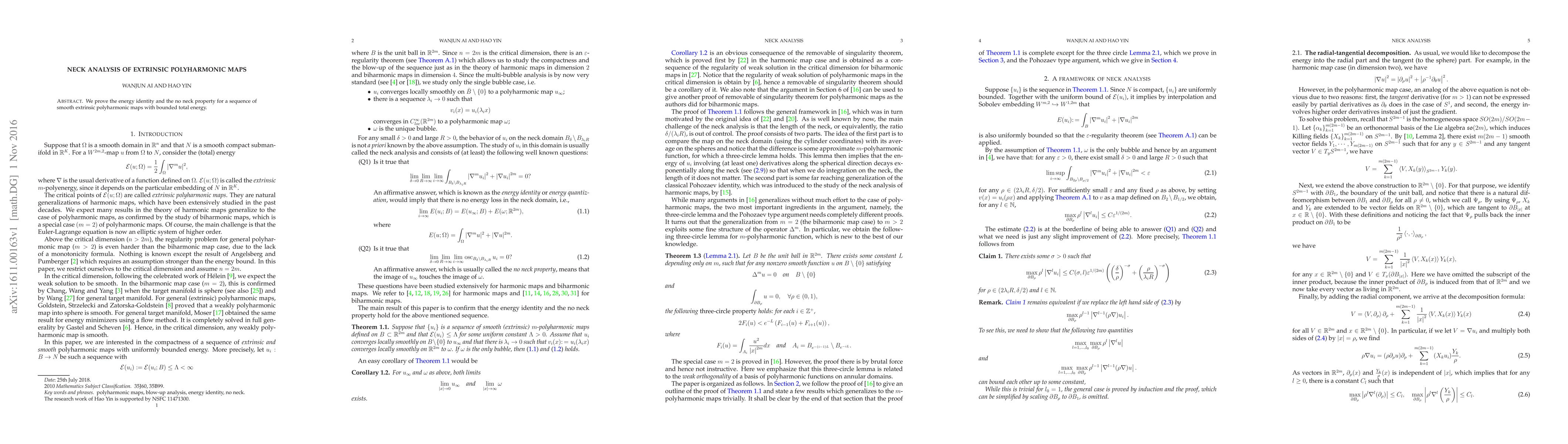 Summary: This paper establishes the energy identity and demonstrates the absence of neck formations in a sequence of smooth extrinsic polyharmonic maps characterized by bounded total energy. The findings contribute to understanding the geometric properties of these maps.