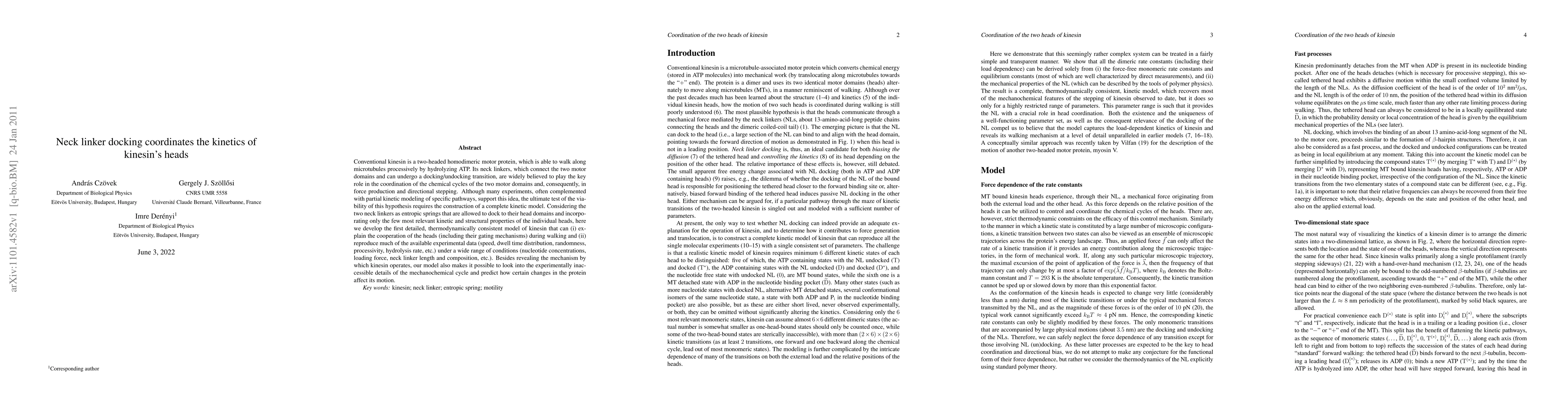 This paper develops a detailed kinetic model for conventional kinesin, demonstrating how neck linker docking coordinates the chemical cycles of its two motor heads, explaining cooperation during microtubule walking and reproducing experimental data. The model also predicts the effects of protein changes on kinesin's motion.