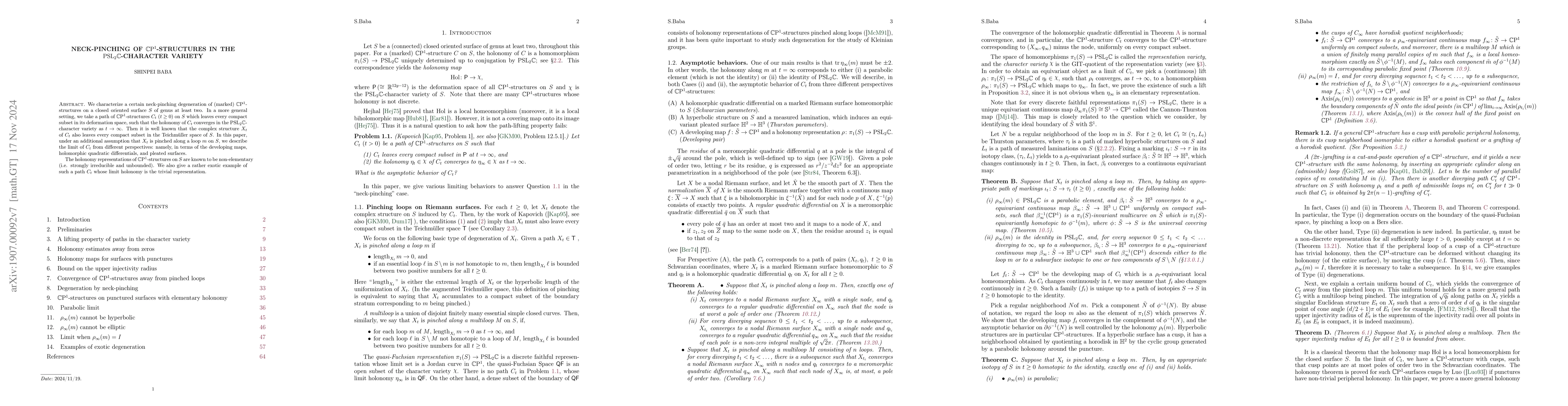 This paper characterizes the neck-pinching degeneration of marked $CP^1$-structures on a closed oriented surface, focusing on paths whose holonomy converges in the $PSL(2,C)$-character variety. It describes the limit of such structures in terms of developing maps, holomorphic quadratic differentials, and pleated surfaces.