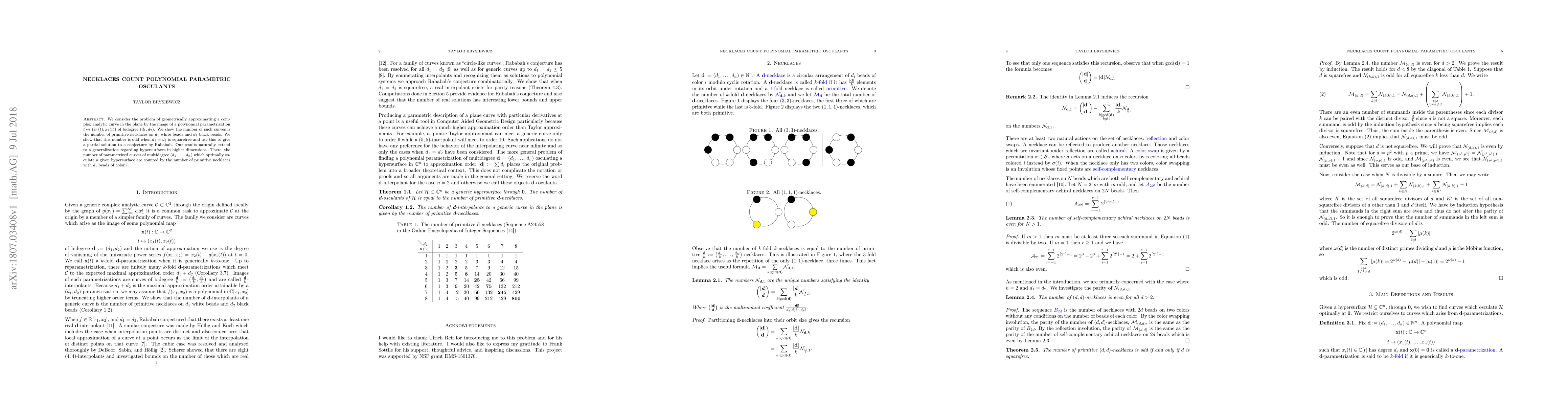 This paper discusses approximating complex analytic curves using polynomial parametrizations, showing the count is equivalent to the number of primitive necklaces with d1 white and d2 black beads. It proves this count is odd when d1 equals d2 and is squarefree, contributing to a conjecture by Rababah. The findings extend to higher dimensions, counting optimal osculation curves via necklace counts with multidegree parameters.