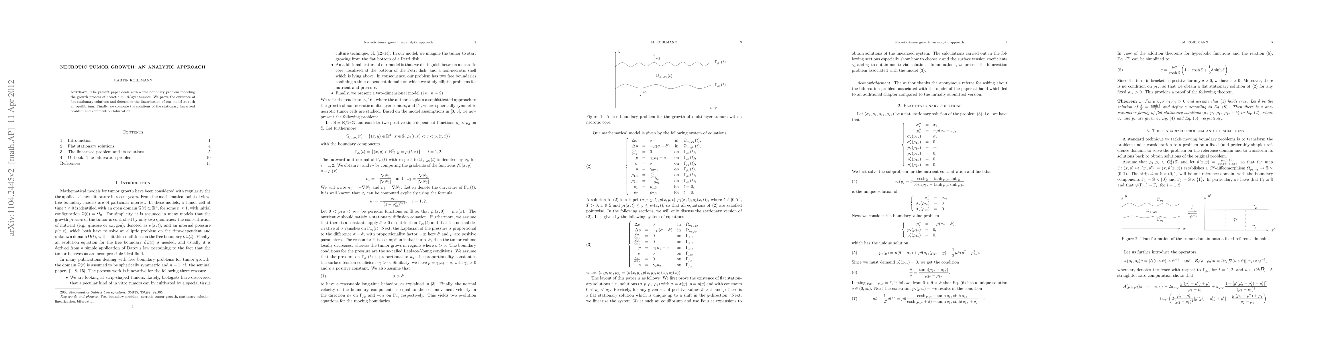 This paper models the growth of necrotic multi-layer tumors using a free boundary problem, proving the existence of flat stationary solutions and analyzing their linearization. The study concludes with a discussion on bifurcation phenomena in the context of the stationary linearized model.