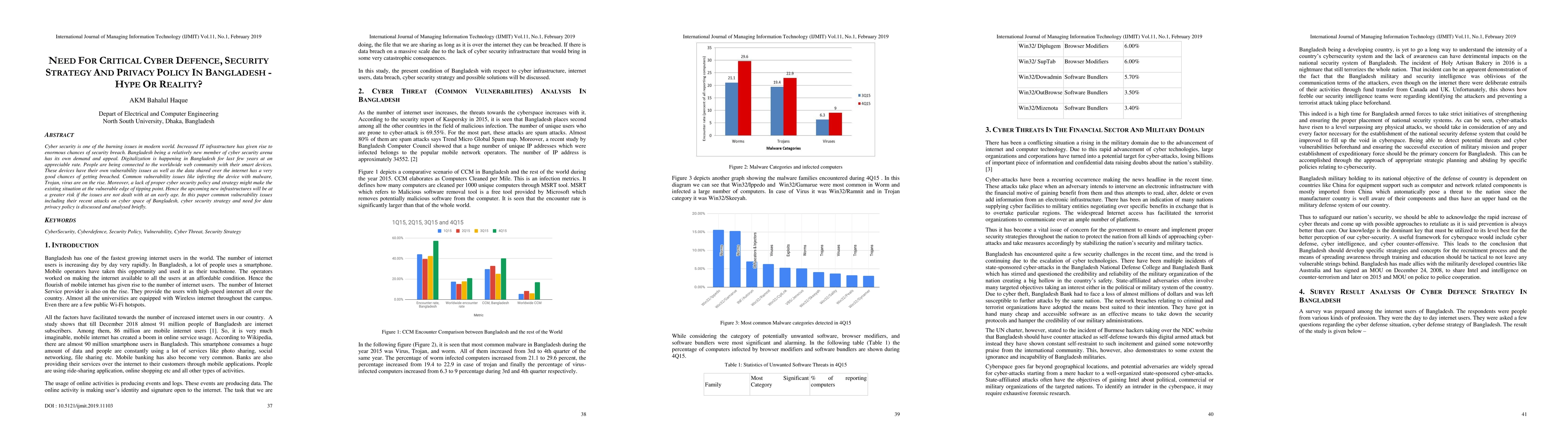 Cyber security is one of the burning issues in modern world. Increased IT infrastructure has given rise to enormous chances of security breach. Bangladesh being a relatively new member of cyber security arena has its own demand and appeal. Digitalization is happening in Bangladesh for last few years at an appreciable rate. People are being connected to the worldwide web community with their smart devices. These devices have their own vulnerability issues as well as the data shared over the internet has a very good chances of getting breached. Common vulnerability issues like infecting the device with malware, Trojan, virus are on the rise. Moreover, a lack of proper cyber security policy and strategy might make the existing situation at the vulnerable edge of tipping point. Hence the upcoming new infrastructures will be at a greater risk if the issues are not dealt with at an early age. In this paper common vulnerability issues including their recent attacks on cyber space of Bangladesh, cyber security strategy and need for data privacy policy is discussed and analysed briefly.