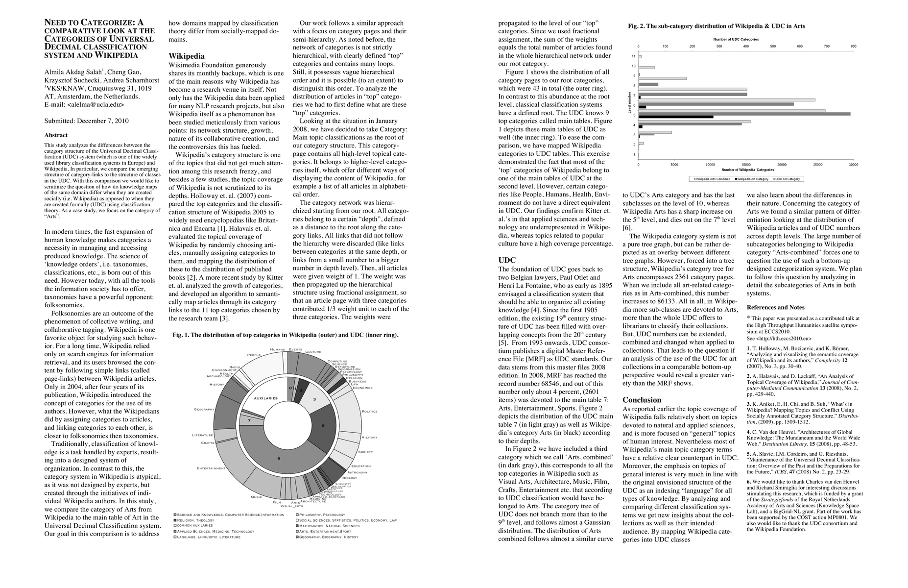 This study analyzes the differences between the category structure of the Universal Decimal Classification (UDC) system (which is one of the widely used library classification systems in Europe) and Wikipedia. In particular, we compare the emerging structure of category-links to the structure of classes in the UDC. With this comparison we would like to scrutinize the question of how do knowledge maps of the same domain differ when they are created socially (i.e. Wikipedia) as opposed to when they are created formally (UDC) using classificatio theory. As a case study, we focus on the category of "Arts".