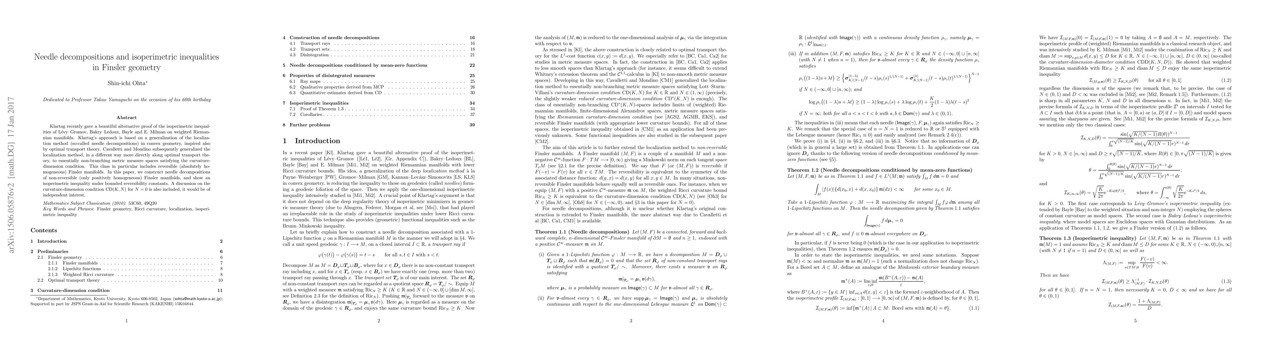 Klartag recently gave a beautiful alternative proof of the isoperimetric inequalities of Levy-Gromov, Bakry-Ledoux, Bayle and E. Milman on weighted Riemannian manifolds. Klartag's approach is based on a generalization of the localization method (so-called needle decompositions) in convex geometry, inspired also by optimal transport theory. Cavalletti and Mondino subsequently generalized the localization method, in a different way more directly along optimal transport theory, to essentially non-branching metric measure spaces satisfying the curvature-dimension condition. This class in particular includes reversible (absolutely homogeneous) Finsler manifolds. In this paper, we construct needle decompositions of non-reversible (only positively homogeneous) Finsler manifolds, and show an isoperimetric inequality under bounded reversibility constants. A discussion on the curvature-dimension condition CD$(K,N)$ for $N = 0$ is also included, it would be of independent interest.