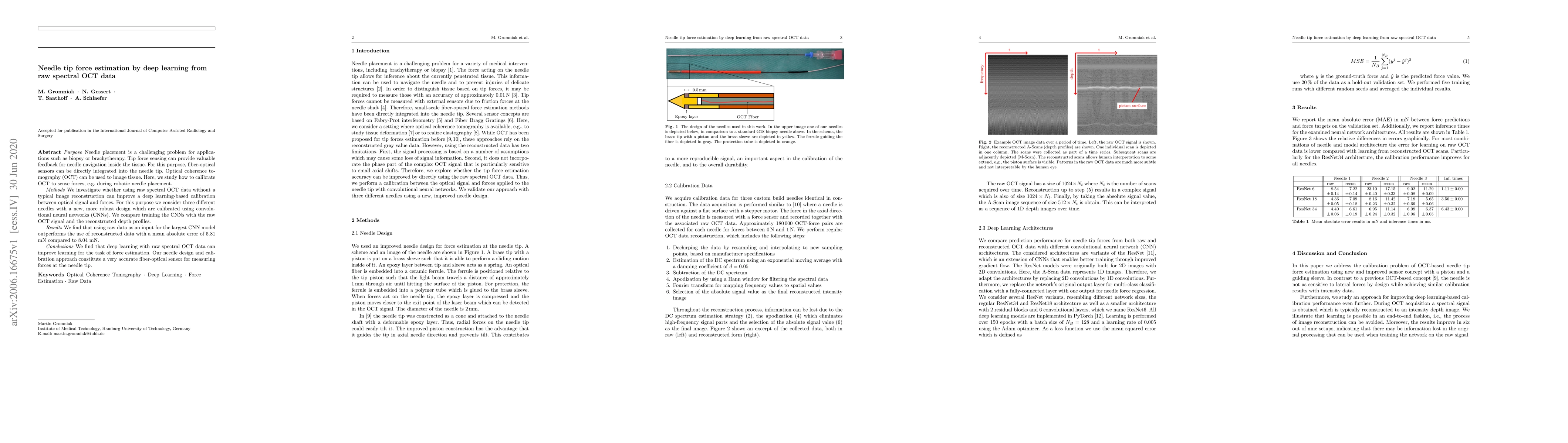 Purpose. Needle placement is a challenging problem for applications such as biopsy or brachytherapy. Tip force sensing can provide valuable feedback for needle navigation inside the tissue. For this purpose, fiber-optical sensors can be directly integrated into the needle tip. Optical coherence tomography (OCT) can be used to image tissue. Here, we study how to calibrate OCT to sense forces, e.g. during robotic needle placement. Methods. We investigate whether using raw spectral OCT data without a typical image reconstruction can improve a deep learning-based calibration between optical signal and forces. For this purpose, we consider three different needles with a new, more robust design which are calibrated using convolutional neural networks (CNNs). We compare training the CNNs with the raw OCT signal and the reconstructed depth profiles. Results. We find that using raw data as an input for the largest CNN model outperforms the use of reconstructed data with a mean absolute error of 5.81 mN compared to 8.04 mN. Conclusions. We find that deep learning with raw spectral OCT data can improve learning for the task of force estimation. Our needle design and calibration approach constitute a very accurate fiber-optical sensor for measuring forces at the needle tip.