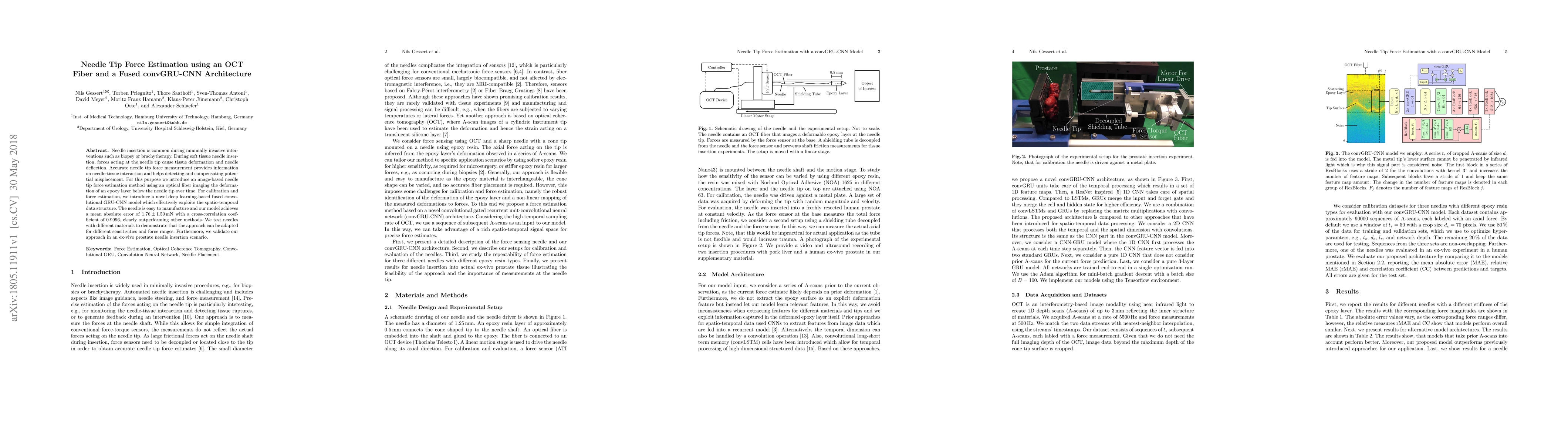 This paper proposes an image-based method for estimating needle tip force during minimally invasive procedures using optical coherence tomography (OCT) fiber imaging. A novel fused convolutional GRU-CNN model is introduced for accurate force estimation, achieving a mean absolute error of 1.76 mN with high correlation, validated in ex-vivo prostate tissue.