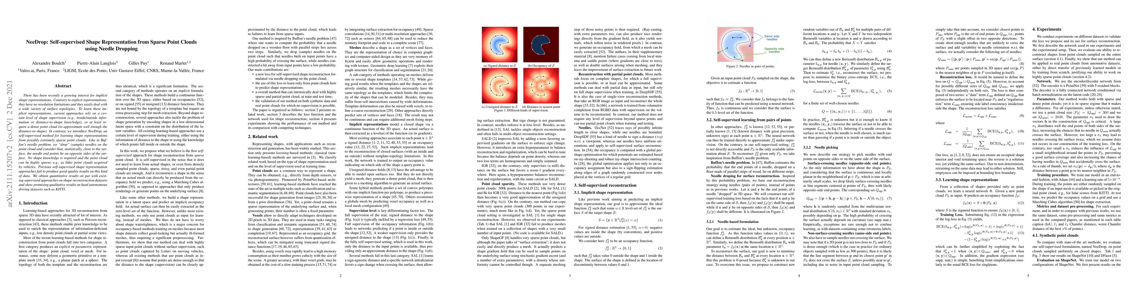 There has been recently a growing interest for implicit shape representations. Contrary to explicit representations, they have no resolution limitations and they easily deal with a wide variety of surface topologies. To learn these implicit representations, current approaches rely on a certain level of shape supervision (e.g., inside/outside information or distance-to-shape knowledge), or at least require a dense point cloud (to approximate well enough the distance-to-shape). In contrast, we introduce NeeDrop, a self-supervised method for learning shape representations from possibly extremely sparse point clouds. Like in Buffon's needle problem, we "drop" (sample) needles on the point cloud and consider that, statistically, close to the surface, the needle end points lie on opposite sides of the surface. No shape knowledge is required and the point cloud can be highly sparse, e.g., as lidar point clouds acquired by vehicles. Previous self-supervised shape representation approaches fail to produce good-quality results on this kind of data. We obtain quantitative results on par with existing supervised approaches on shape reconstruction datasets and show promising qualitative results on hard autonomous driving datasets such as KITTI.
