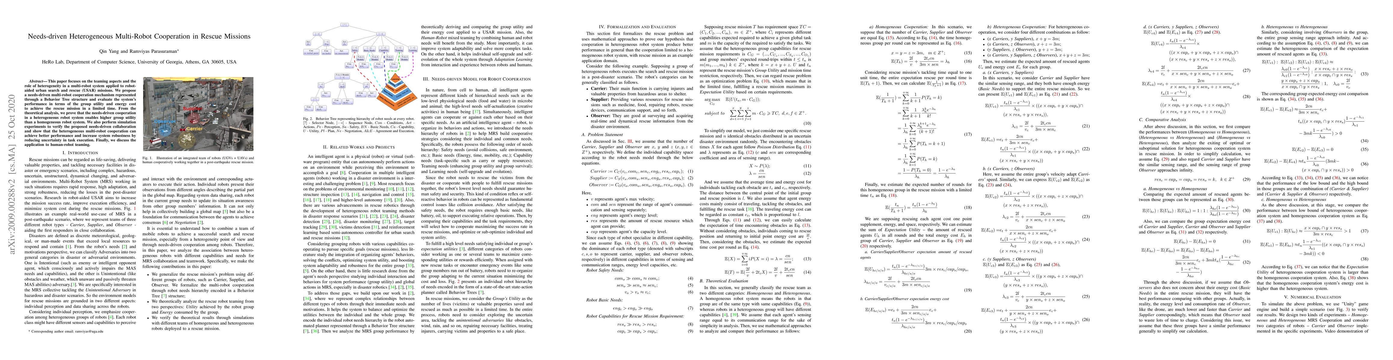 This paper focuses on the teaming aspects and the role of heterogeneity in a multi-robot system applied to robot-aided urban search and rescue (USAR) missions. We propose a needs-driven multi-robot cooperation mechanism represented through a Behavior Tree structure and evaluate the system's performance in terms of the group utility and energy cost to achieve the rescue mission in a limited time. From the theoretical analysis, we prove that the needs-driven cooperation in a heterogeneous robot system enables higher group utility than a homogeneous robot system. We also perform simulation experiments to verify the proposed needs-driven collaboration and show that the heterogeneous multi-robot cooperation can achieve better performance and increase system robustness by reducing uncertainty in task execution. Finally, we discuss the application to human-robot teaming.