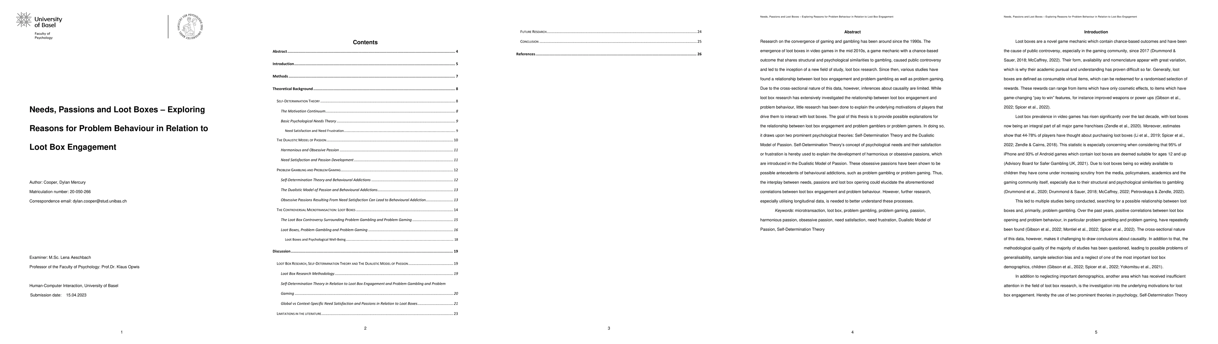 This paper explores the motivations behind loot box engagement in video games, linking it to problem gambling and gaming. It uses Self-Determination Theory and the Dualistic Model of Passion to explain how psychological needs and obsessive passions may drive problematic behaviour, suggesting that understanding these factors could clarify the relationship between loot box use and addiction.