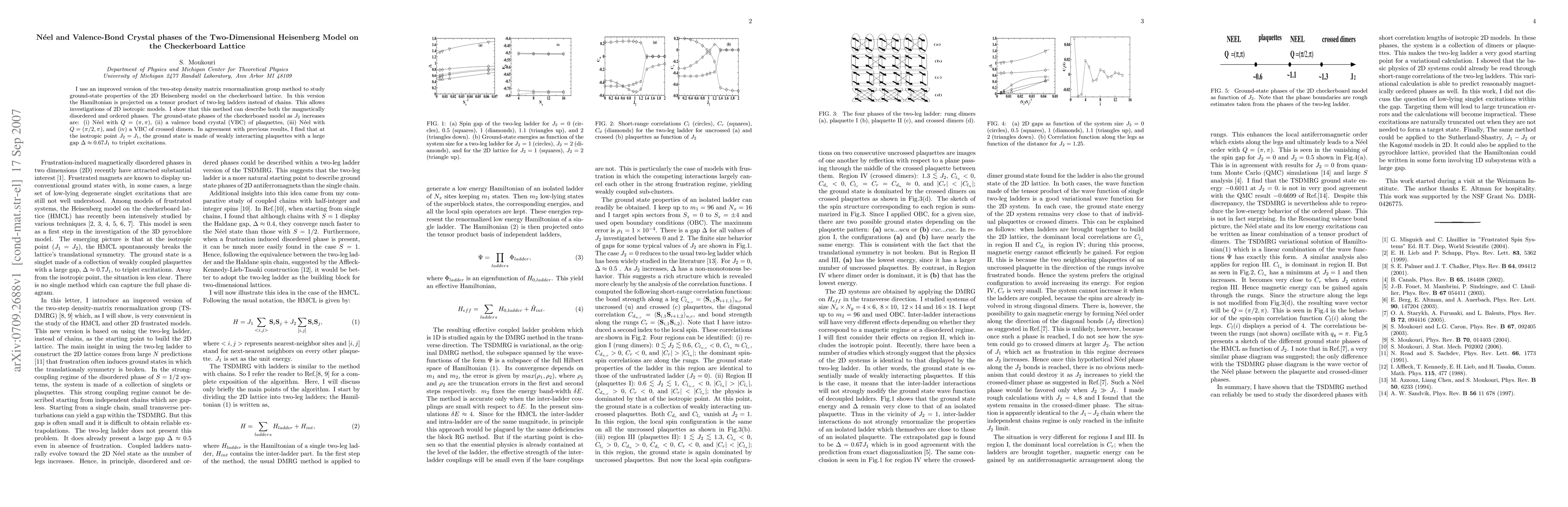 I use an improved version of the two-step density matrix renormalization group method to study ground-state properties of the 2D Heisenberg model on the checkerboard lattice. In this version the Hamiltonian is projected on a tensor product of two-leg ladders instead of chains. This allows investigations of 2D isotropic models. I show that this method can describe both the magnetically disordered and ordered phases. The ground-state phases of the checkerboard model as $J_2$ increases are: (i) N\'eel with $Q=(\pi,\pi)$, (ii) a valence bond crystal (VBC) of plaquettes, (iii) N\'eel with $Q=(\pi/2,\pi)$, and (iv) a VBC of crossed dimers. In agreement with previous results, I find that at the isotropic point $J_2=J_1$, the ground state is made of weakly interacting plaquettes with a large gap $\Delta \approx 0.67 J_1$ to triplet excitations.
