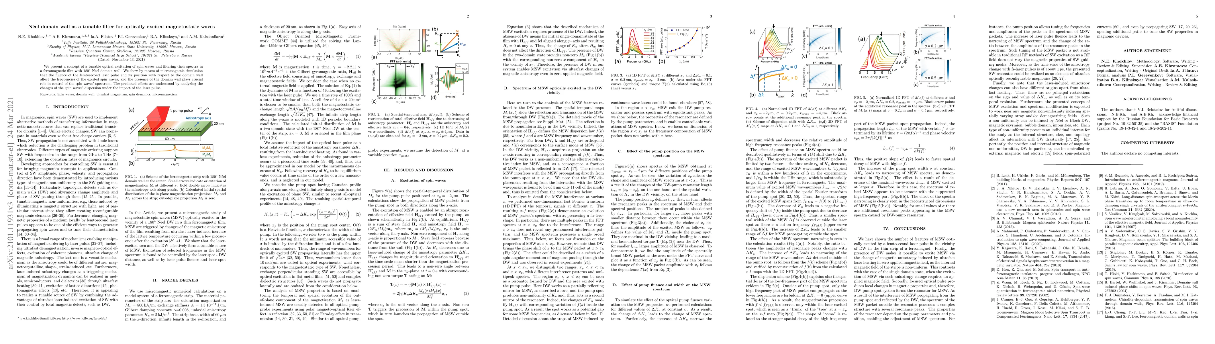 We present a concept of a tunable optical excitation of spin waves and filtering their spectra in a ferromagnetic film with 180$^{\circ}$ N\'eel domain wall. We show by means of micromagnetic simulation that the fluence of the femtosecond laser pulse and its position with respect to the domain wall affect the frequencies of the excited spin waves, and the presence of the domain wall plays crucial role in control of the spin waves' spectrum. The predicted effects are understood by analyzing the changes of the spin waves' dispersion under the impact of the laser pulse.