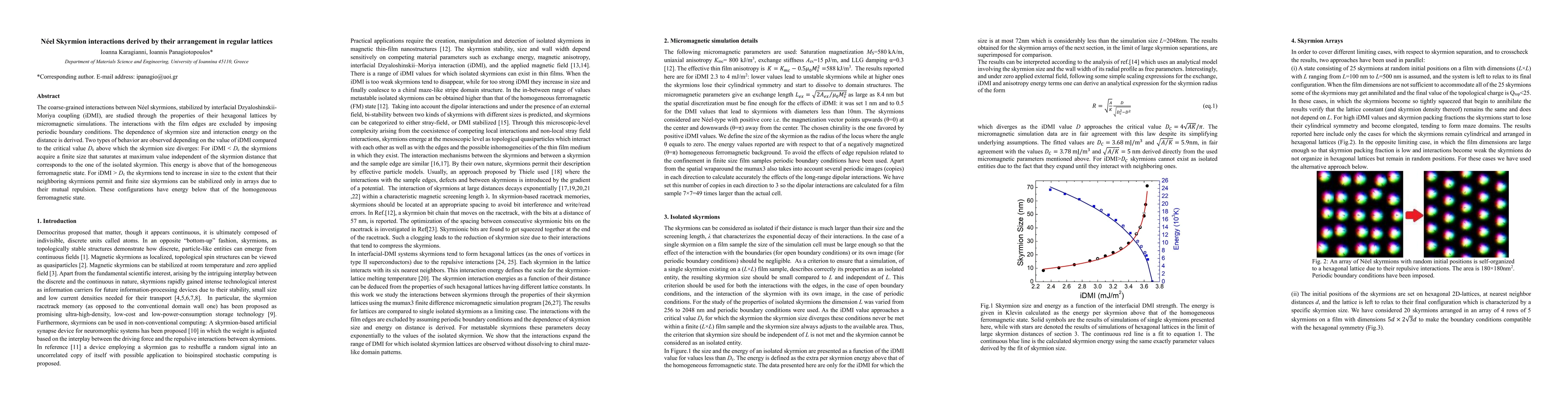 The coarse-grained interactions between N\'eel skyrmions, stabilized by interfacial Dzyaloshinskii-Moriya coupling (iDMI), are studied through the properties of their hexagonal lattices by micromagnetic simulations. The interactions with the film edges are excluded by imposing periodic boundary conditions. The dependence of skyrmion size and interaction energy on the distance is derived. Two types of behavior are observed depending on the value of iDMI compared to the critical value Dc above which the skyrmion size diverges: For iDMI < Dc the skyrmions acquire a finite size that saturates at maximum value independent of the skyrmion distance that corresponds to the one of the isolated skyrmion. This energy is above that of the homogeneous ferromagnetic state. For iDMI > Dc the skyrmions tend to increase in size to the extent that their neighboring skyrmions permit and finite size skyrmions can be stabilized only in arrays due to their mutual repulsion. These configurations have energy below that of the homogeneous ferromagnetic state.