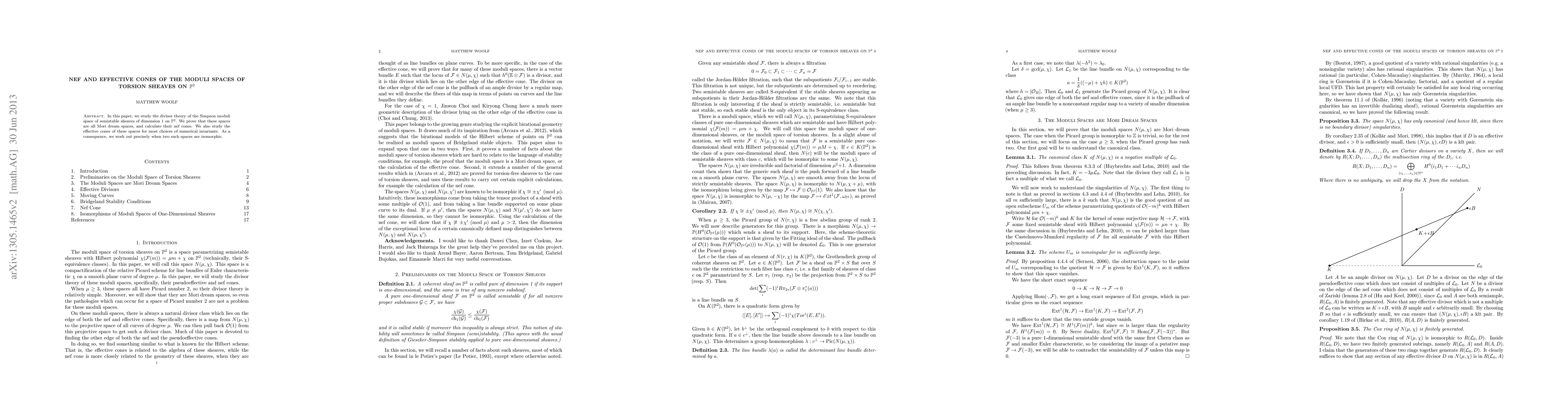 This paper investigates the divisor theory of Simpson moduli spaces for semistable sheaves of dimension 1 on the projective plane, proving they are Mori dream spaces and determining their nef and effective cones. It also determines when two such spaces are isomorphic.