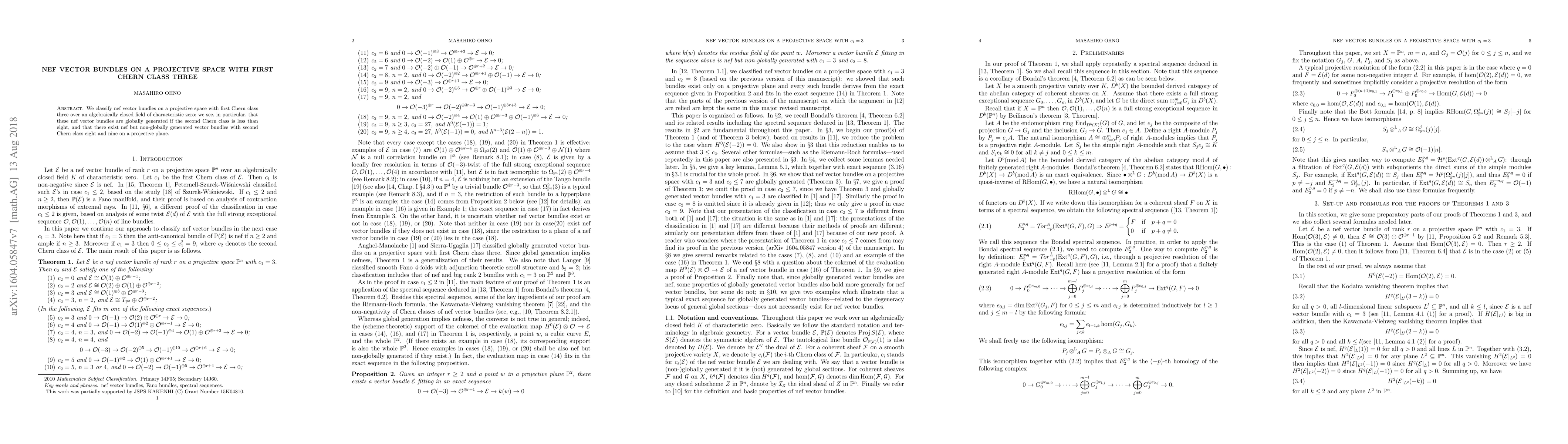 This paper classifies nef vector bundles on a projective space with a first Chern class of three. It finds that these bundles are globally generated when the second Chern class is below eight, but there exist nef non-globally generated bundles for second Chern classes of eight and nine on a projective plane.