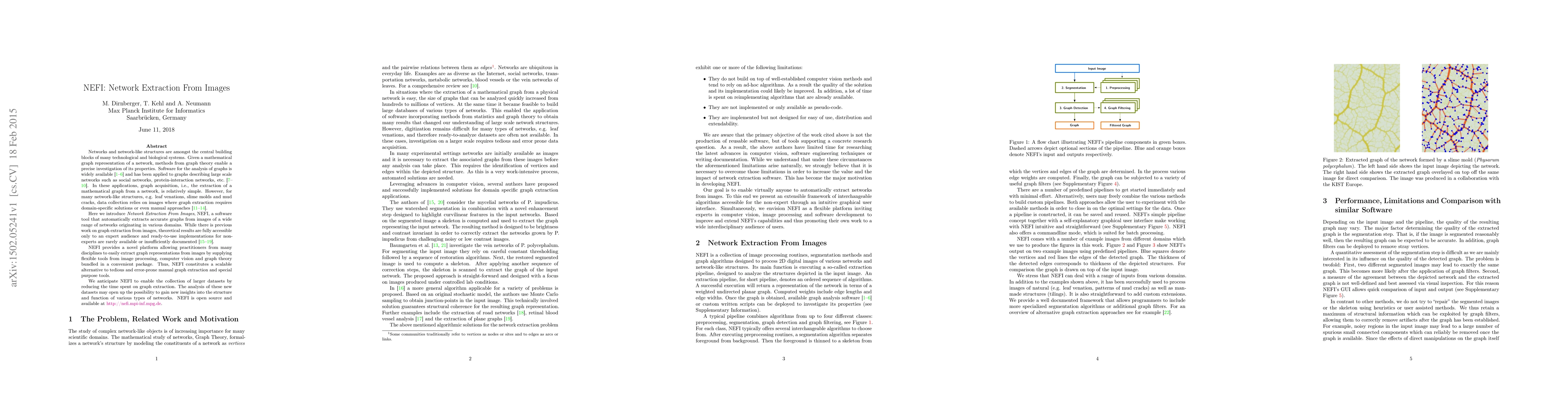 Networks and network-like structures are amongst the central building blocks of many technological and biological systems. Given a mathematical graph representation of a network, methods from graph theory enable a precise investigation of its properties. Software for the analysis of graphs is widely available and has been applied to graphs describing large scale networks such as social networks, protein-interaction networks, etc. In these applications, graph acquisition, i.e., the extraction of a mathematical graph from a network, is relatively simple. However, for many network-like structures, e.g. leaf venations, slime molds and mud cracks, data collection relies on images where graph extraction requires domain-specific solutions or even manual. Here we introduce Network Extraction From Images, NEFI, a software tool that automatically extracts accurate graphs from images of a wide range of networks originating in various domains. While there is previous work on graph extraction from images, theoretical results are fully accessible only to an expert audience and ready-to-use implementations for non-experts are rarely available or insufficiently documented. NEFI provides a novel platform allowing practitioners from many disciplines to easily extract graph representations from images by supplying flexible tools from image processing, computer vision and graph theory bundled in a convenient package. Thus, NEFI constitutes a scalable alternative to tedious and error-prone manual graph extraction and special purpose tools. We anticipate NEFI to enable the collection of larger datasets by reducing the time spent on graph extraction. The analysis of these new datasets may open up the possibility to gain new insights into the structure and function of various types of networks. NEFI is open source and available http://nefi.mpi-inf.mpg.de.