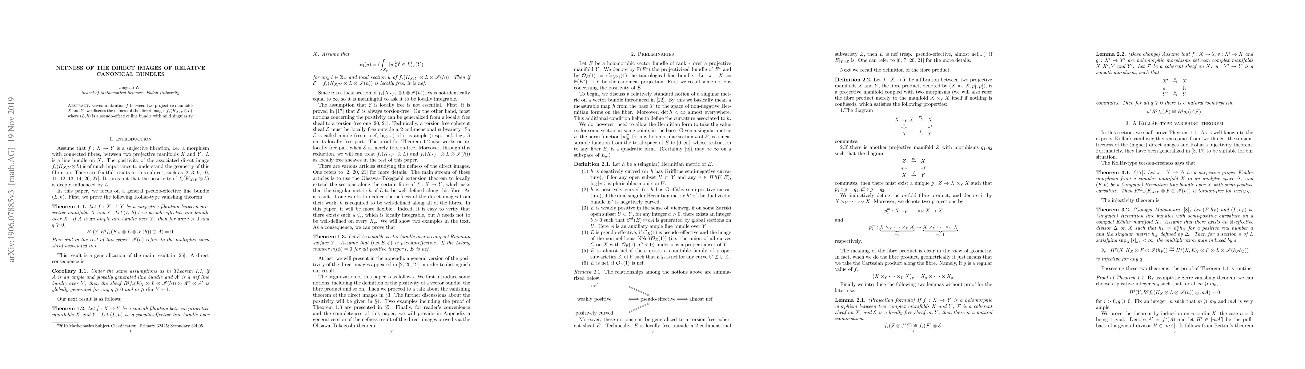 Given a fibration $f$ between two projective manifolds $X$ and $Y$, we discuss the nefness of the direct images $f_{\ast}(K_{X/Y}\otimes L)$, where $(L,h)$ is a pseudo-effective line bundle with mild singularity.