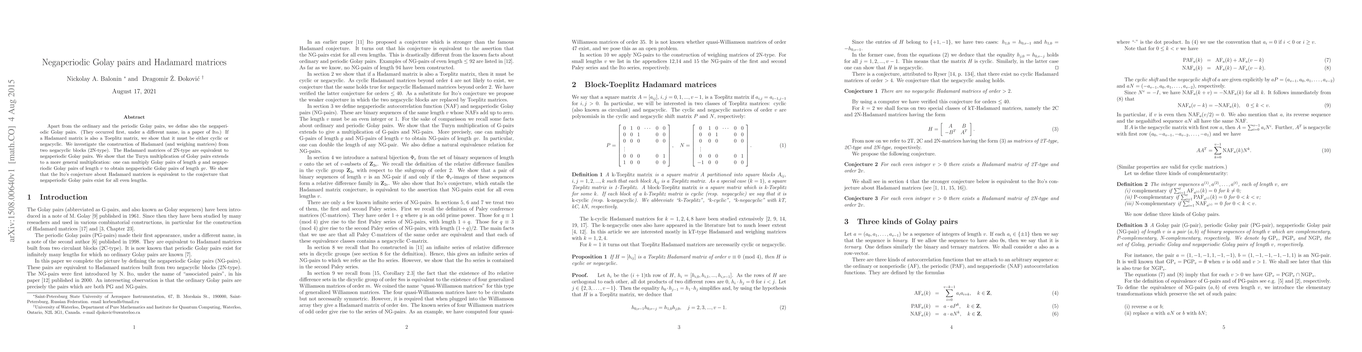 Apart from the ordinary and the periodic Golay pairs, we define also the negaperiodic Golay pairs. (They occurred first, under a different name, in a paper of Ito.) If a Hadamard matrix is also a Toeplitz matrix, we show that it must be either cyclic or negacyclic. We investigate the construction of Hadamard (and weighing matrices) from two negacyclic blocks (2N-type). The Hadamard matrices of 2N-type are equivalent to negaperiodic Golay pairs. We show that the Turyn multiplication of Golay pairs extends to a more general multiplication: one can multiply Golay pairs of length $g$ and negaperiodic Golay pairs of length $v$ to obtain negaperiodic Golay pairs of length $gv$. We show that the Ito's conjecture about Hadamard matrices is equivalent to the conjecture that negaperiodic Golay pairs exist for all even lengths.