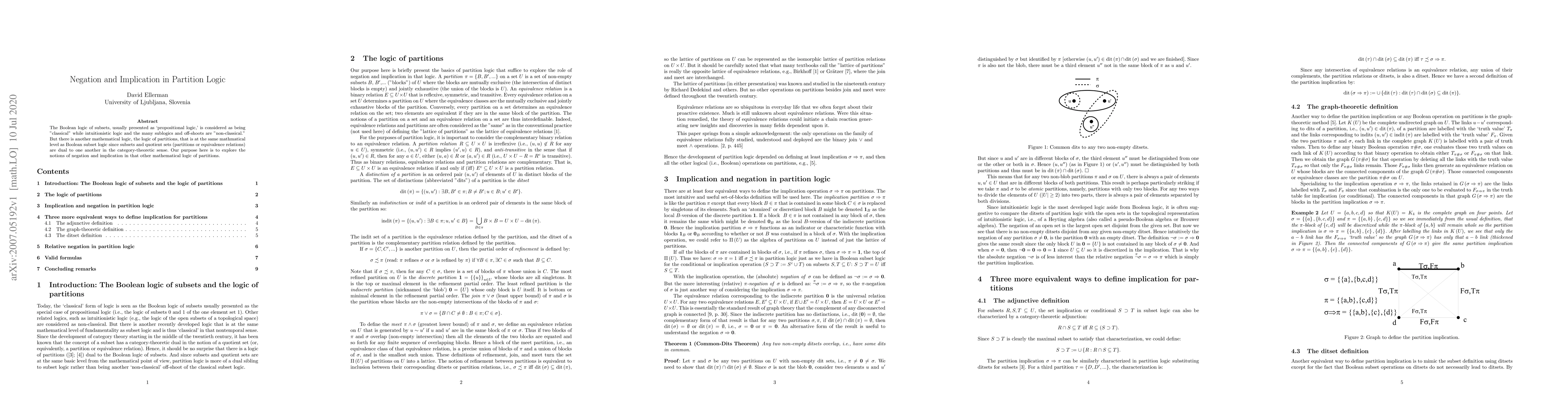 The Boolean logic of subsets, usually presented as `propositional logic,' is considered as being "classical" while intuitionistic logic and the many sublogics and off-shoots are "non-classical." But there is another mathematical logic, the logic of partitions, that is at the same mathmatical level as Boolean subset logic since subsets and quotient sets (partitions or equivalence relations) are dual to one another in the category-theoretic sense. Our purpose here is to explore the notions of negation and implication in that other mathematical logic of partitions.