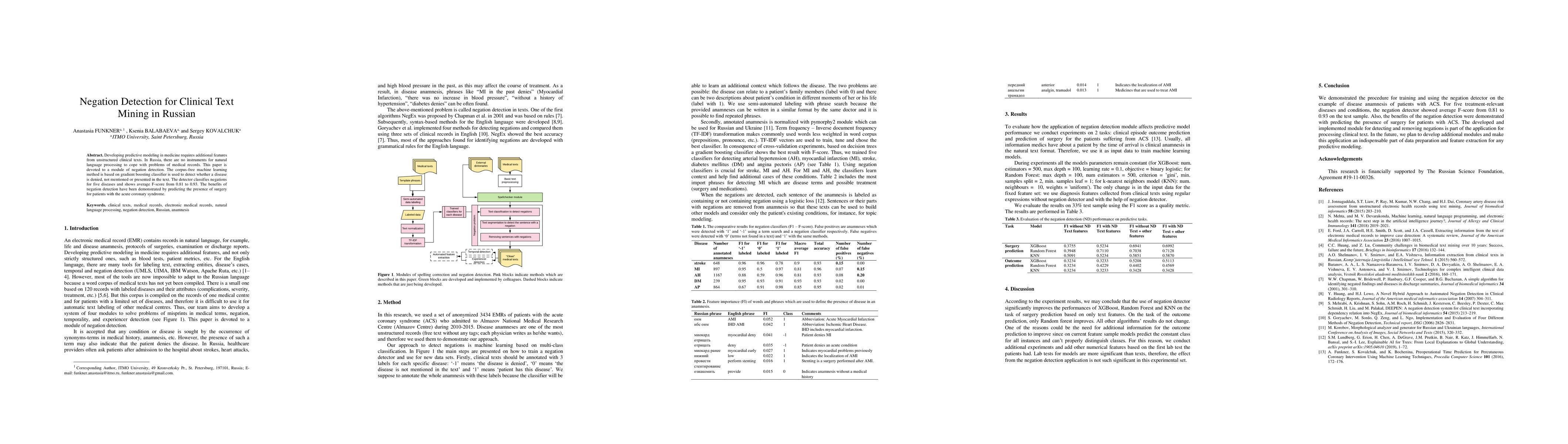 This paper introduces a corpus-free machine learning method using gradient boosting to detect negations in Russian clinical texts, classifying the presence or absence of five diseases. The model achieves an average F-score from 0.81 to 0.93, demonstrating its utility in predicting surgery for patients with acute coronary syndrome.