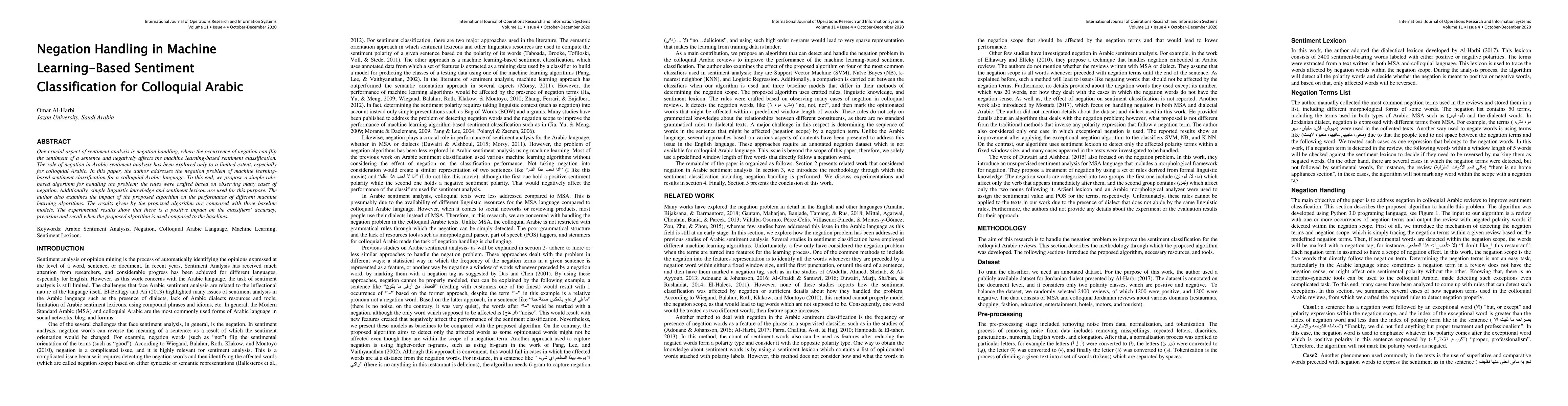 This paper proposes a rule-based algorithm to handle negation in machine learning-based sentiment classification for colloquial Arabic, improving classifier performance. The algorithm shows better accuracy, precision, and recall compared to baseline models.