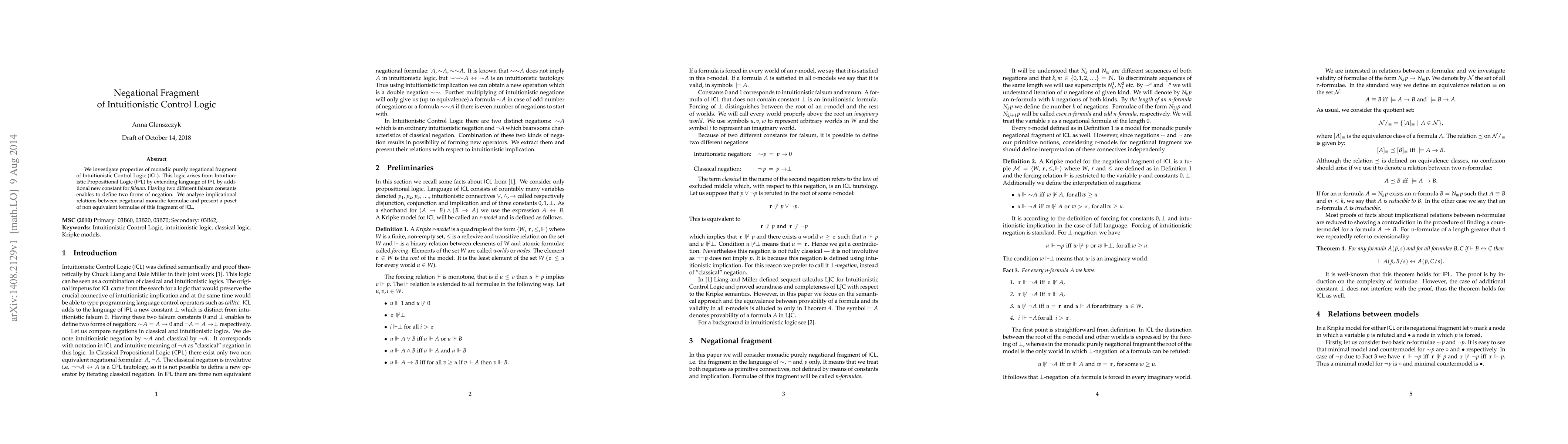 We investigate properties of monadic purely negational fragment of Intuitionistic Control Logic (ICL). This logic arises from Intuitionistic Propositional Logic (IPL) by extending language of IPL by additional new constant for falsum. Having two different falsum constants enables to define two forms of negation. We analyse implicational relations between negational monadic formulae and present a poset of non equivalent formulae of this fragment of ICL.