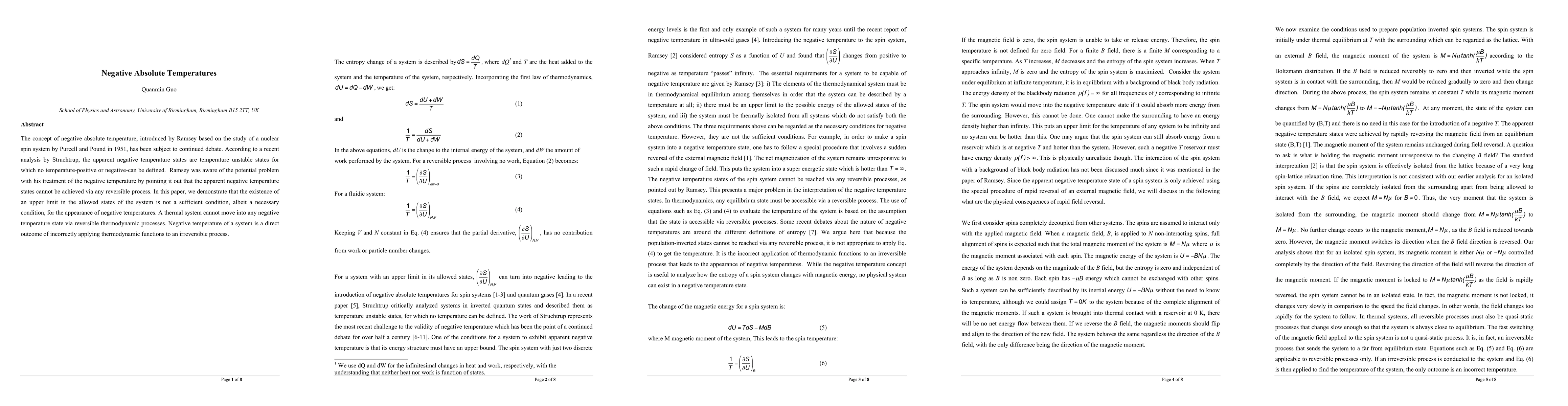 This paper argues that negative absolute temperatures, first proposed by Ramsey, cannot be achieved through reversible processes and arise from incorrectly applying thermodynamic functions to irreversible processes. The authors conclude that negative temperature states are inherently unstable and cannot exist in a thermal system via reversible thermodynamic processes.