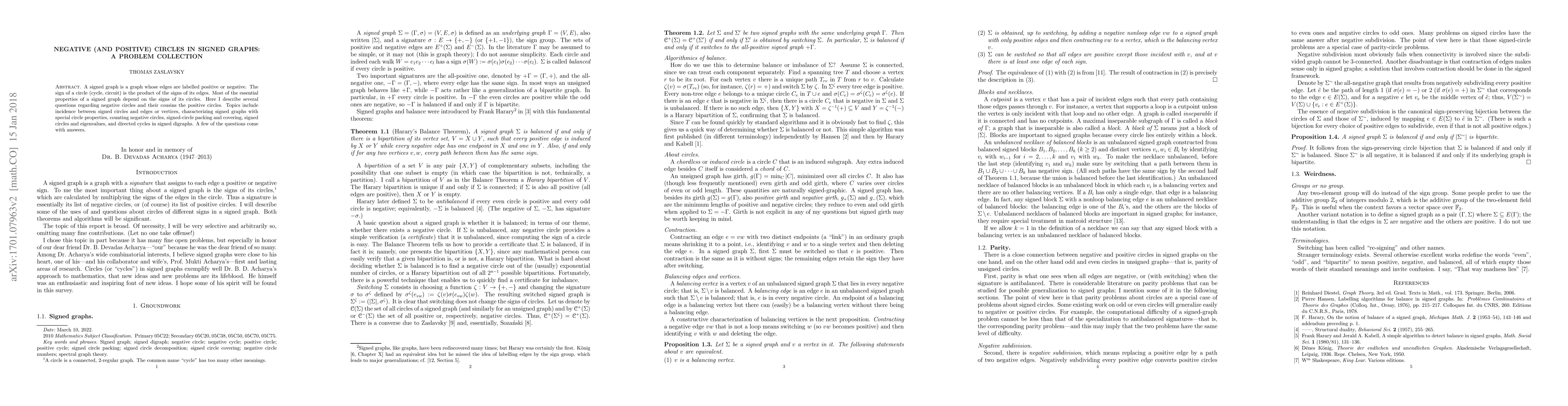 A signed graph is a graph whose edges are labelled positive or negative. The sign of a circle (cycle, circuit) is the product of the signs of its edges. Most of the essential properties of a signed graph depend on the signs of its circles. Here I describe several questions regarding negative circles and their cousins the positive circles. Topics include incidence between signed circles and edges or vertices, characterizing signed graphs with special circle properties, counting negative circles, signed-circle packing and covering, signed circles and eigenvalues, and directed cycles in signed digraphs. A few of the questions come with answers.