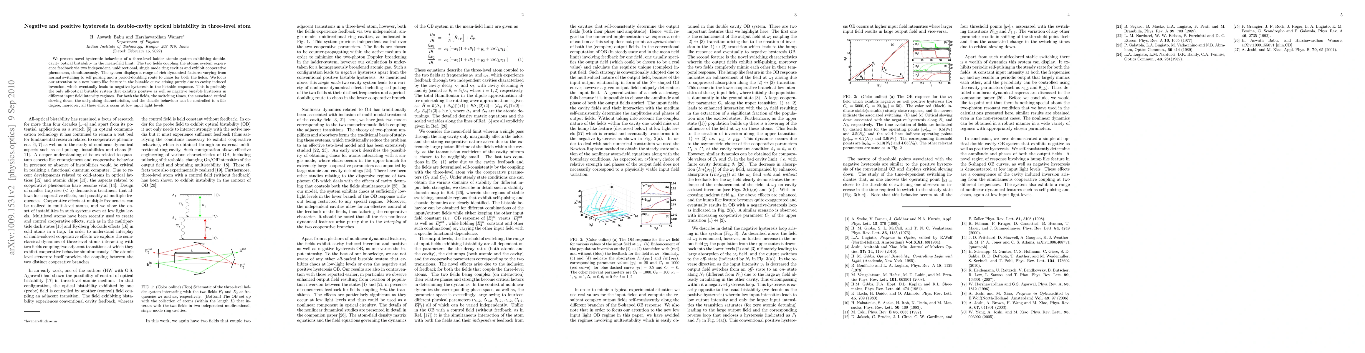 We present novel hysteretic behaviour of a three-level ladder atomic system exhibiting double-cavity optical bistability in the mean-field limit. The two fields coupling the atomic system experience feedback via two independent, unidirectional, single mode ring cavities and exhibit cooperative phenomena, simultaneously. The system displays a range of rich dynamical features varying from normal switching to self pulsing and a period-doubling route to chaos for both the fields. We focus our attention to a new hump like feature in the bistable curve arising purely due to cavity induced inversion, which eventually leads to negative hysteresis in the bistable response. This is probably the only all-optical bistable system that exhibits positive as well as negative bistable hysteresis in different input field intensity regimes. For both the fields, the switching times, the associated critical slowing down, the self-pulsing characteristics, and the chaotic behaviour can be controlled to a fair degree, moreover, all these effects occur at low input light levels.