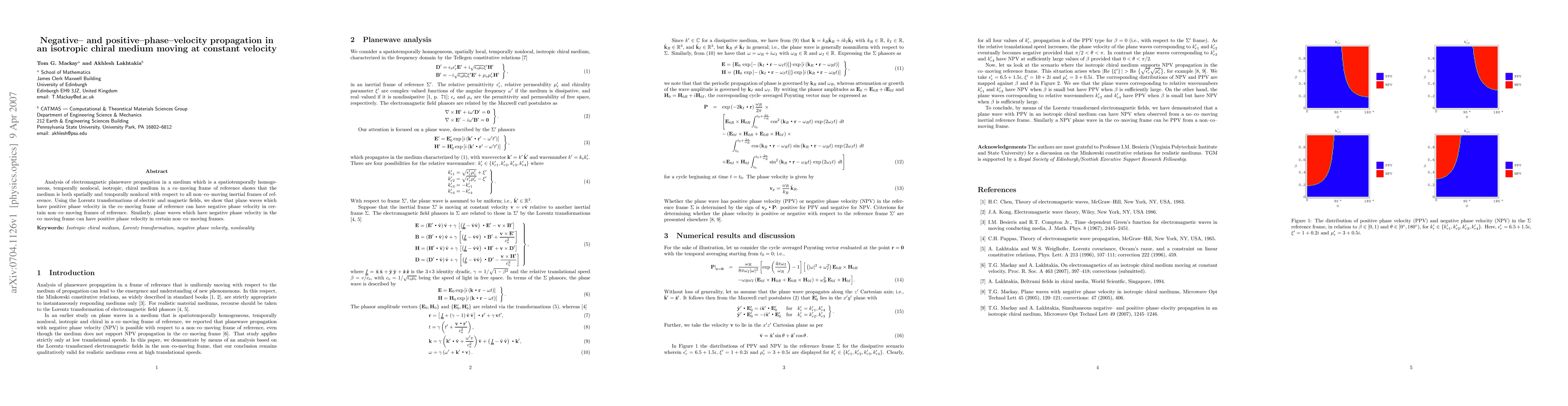 This paper investigates electromagnetic wave propagation in an isotropic chiral medium moving at constant velocity, revealing that the medium exhibits spatial and temporal nonlocality in non-co-moving frames. It demonstrates that plane waves can exhibit phase velocities of opposite signs depending on the reference frame, using Lorentz transformations.