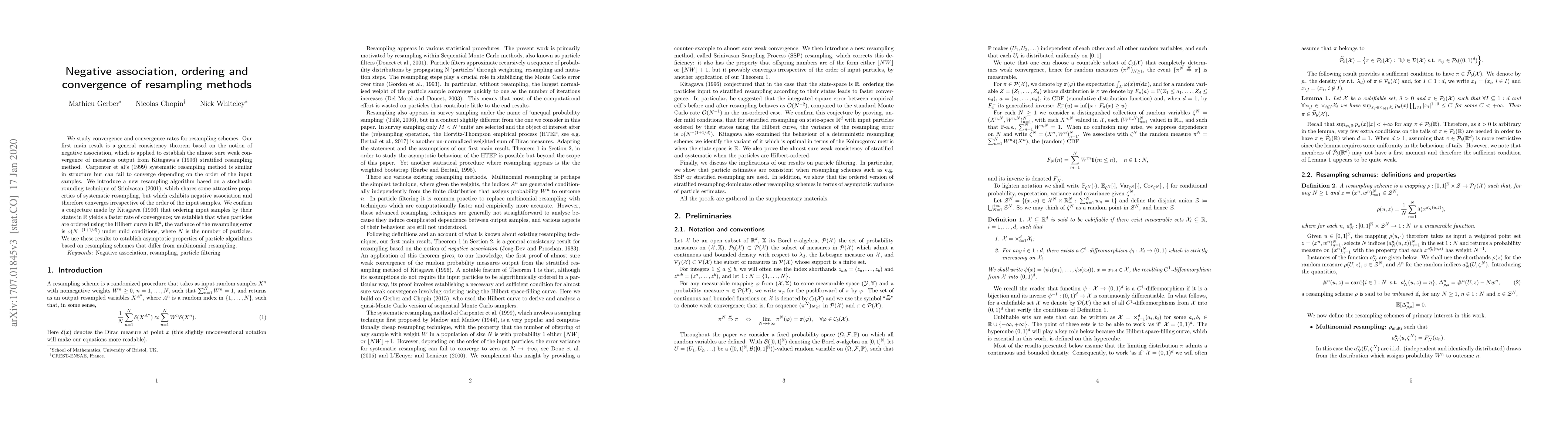 We study convergence and convergence rates for resampling schemes. Our first main result is a general consistency theorem based on the notion of negative association, which is applied to establish the almost-sure weak convergence of measures output from Kitagawa's (1996) stratified resampling method. Carpenter et al's (1999) systematic resampling method is similar in structure but can fail to converge depending on the order of the input samples. We introduce a new resampling algorithm based on a stochastic rounding technique of Srinivasan (2001), which shares some attractive properties of systematic resampling, but which exhibits negative association and therefore converges irrespective of the order of the input samples. We confirm a conjecture made by Kitagawa (1996) that ordering input samples by their states in $\mathbb{R}$ yields a faster rate of convergence; we establish that when particles are ordered using the Hilbert curve in $\mathbb{R}^d$, the variance of the resampling error is ${\scriptscriptstyle\mathcal{O}}(N^{-(1+1/d)})$ under mild conditions, where $N$ is the number of particles. We use these results to establish asymptotic properties of particle algorithms based on resampling schemes that differ from multinomial resampling.