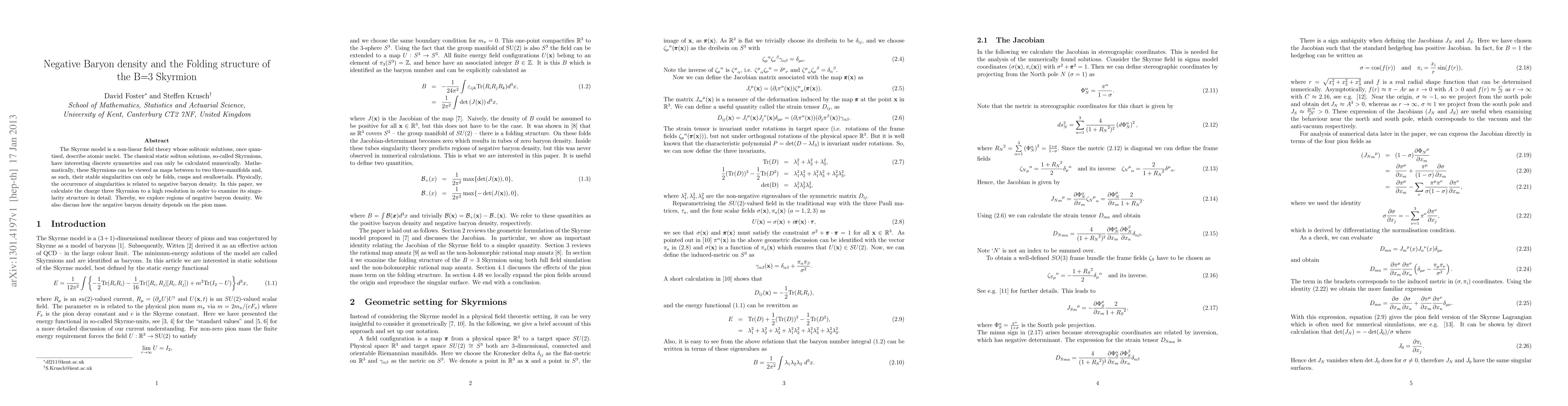 The Skyrme model is a non-linear field theory whose solitonic solutions, once quantised, describe atomic nuclei. The classical static soliton solutions, so-called Skyrmions, have interesting discrete symmetries and can only be calculated numerically. Mathematically, these Skyrmions can be viewed as maps between to two three-manifolds and, as such, their stable singularities can only be folds, cusps and swallowtails. Physically, the occurrence of singularities is related to negative baryon density. In this paper, we calculate the charge three Skyrmion to a high resolution in order to examine its singularity structure in detail. Thereby, we explore regions of negative baryon density. We also discuss how the negative baryon density depends on the pion mass.