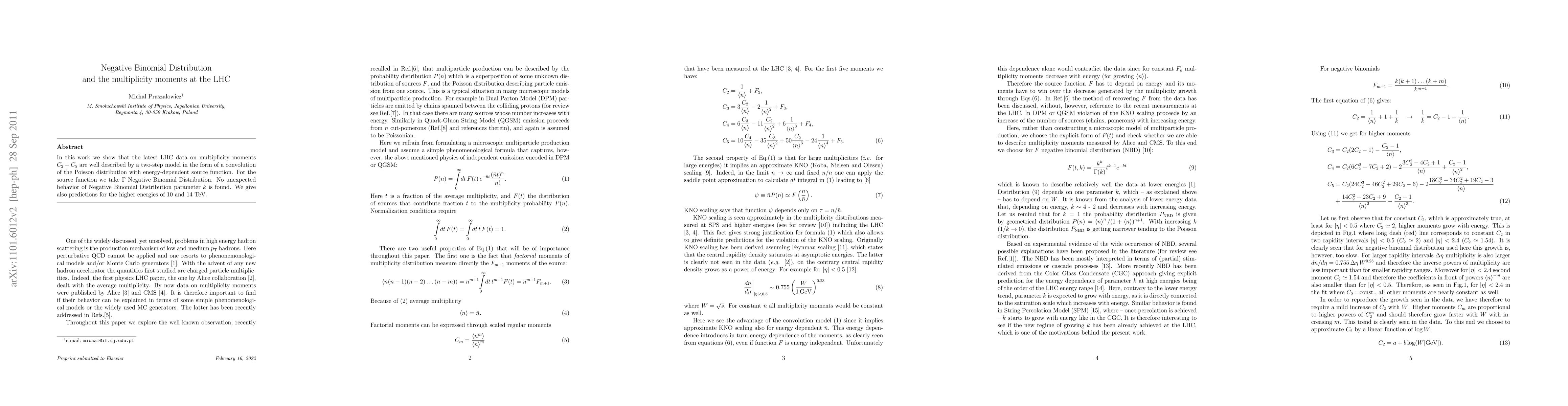 This paper demonstrates that LHC data on multiplicity moments $C_2-C_5$ can be well described by a two-step model involving a convolution of the Poisson distribution with a $\Gamma$ Negative Binomial Distribution as the source function. No unusual behavior in the Negative Binomial Distribution parameter $k$ is observed, and predictions for higher energies of 10 and 14 TeV are provided.
