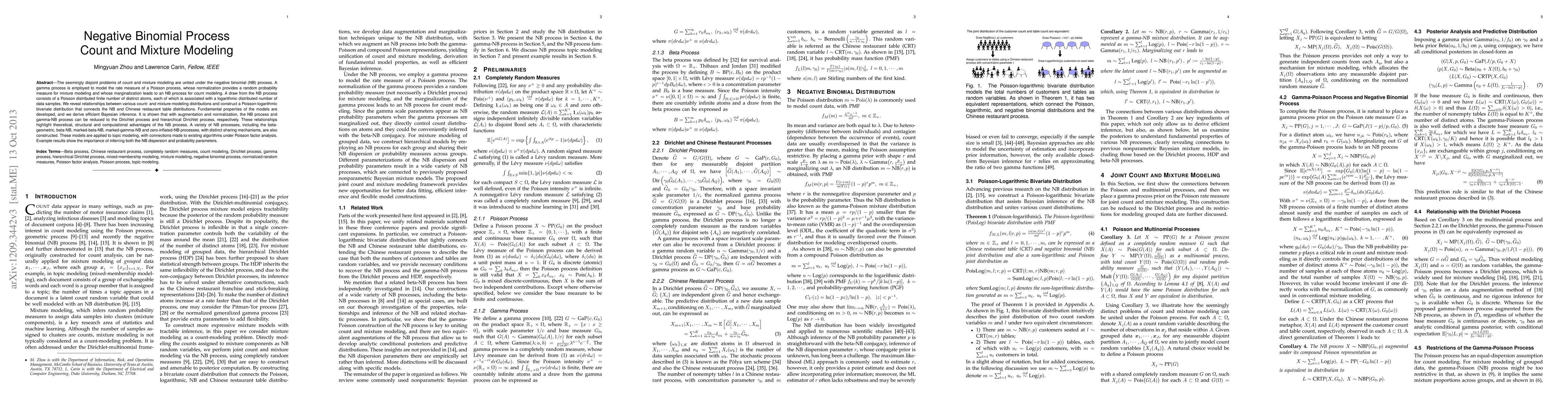 This paper unifies count and mixture modeling through the negative binomial (NB) process, employing a gamma process to model the rate measure of a Poisson process. It constructs a Poisson-logarithmic bivariate distribution and explores various NB processes, demonstrating their theoretical, structural, and computational advantages, and applying them to topic modeling.
