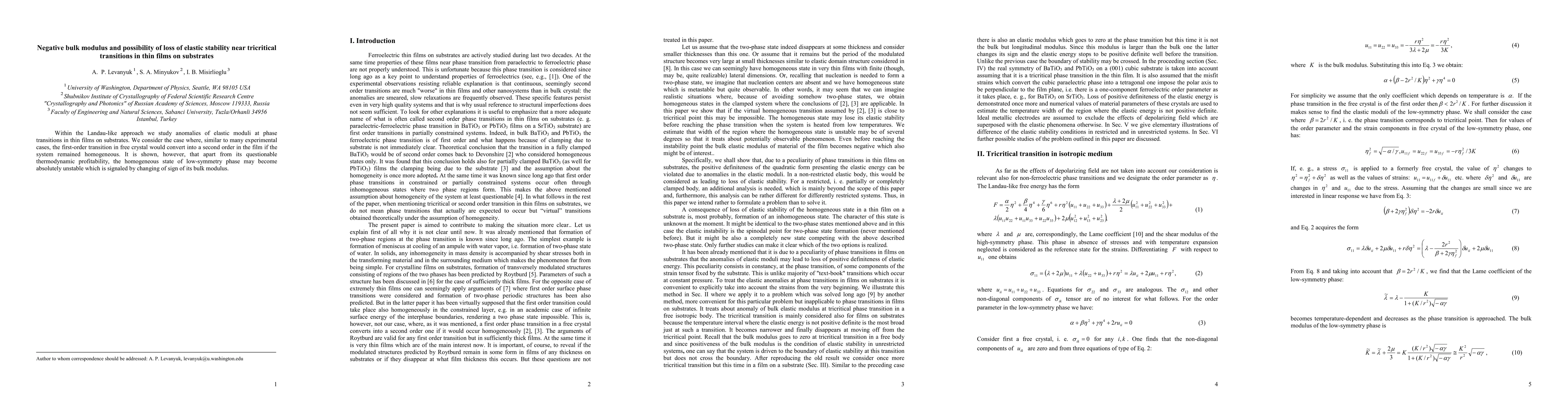 Within the Landau-like approach we study anomalies of elastic moduli at phase transitions in thin films on substrates. We consider the case where, similar to many experimental cases, the first-order transition in free crystal would convert into a second order in the film if the system remained homogeneous. It is shown, however, that apart from its questionable thermodynamic profitability, the homogeneous state of low-symmetry phase may become absolutely unstable which is signaled by changing of sign of its bulk modulus.