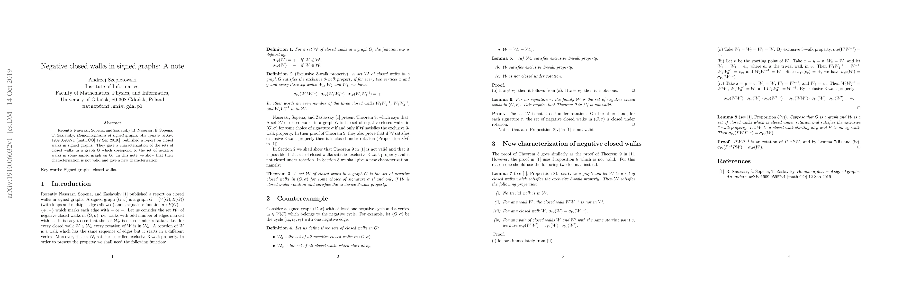 Recently Naserasr, Sopena, and Zaslavsky [R. Naserasr, \'E. Sopena, T. Zaslavsky,Homomorphisms of signed graphs: An update, arXiv: 1909.05982v1 [math.CO] 12 Sep 2019.] published a report on closed walks in signed graphs. They gave a characterization of the sets of closed walks in a graph $G$ which corespond to the set of negative walks in some signed graph on $G$. In this note we show that their characterization is not valid and give a new characterization.