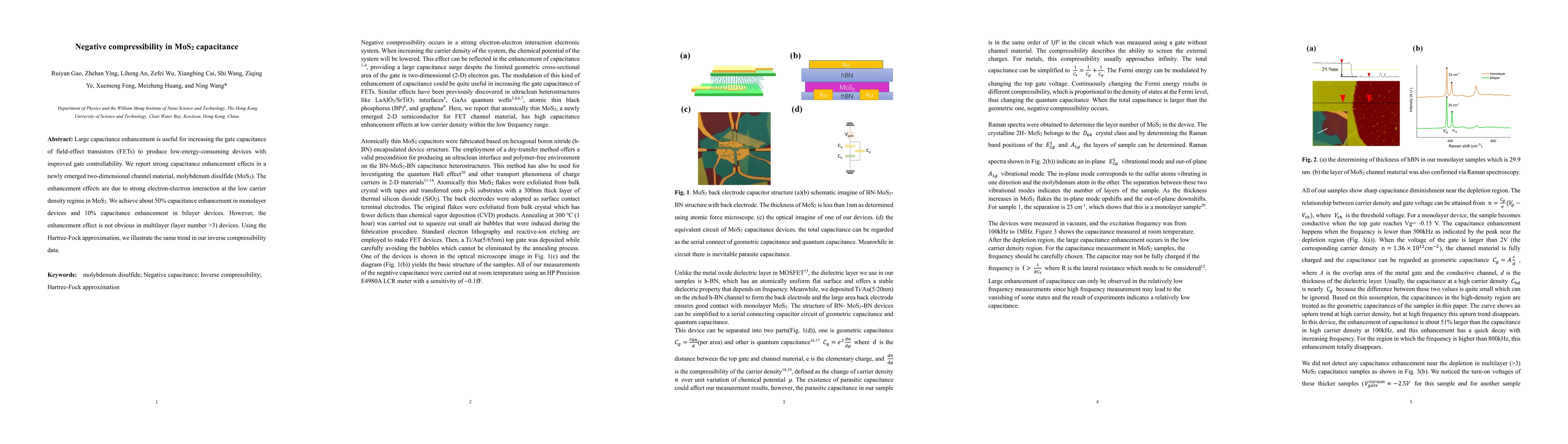 Large capacitance enhancement is useful for increasing the gate capacitance of field-effect transistors (FETs) to produce low-energy-consuming devices with improved gate controllability. We report strong capacitance enhancement effects in a newly emerged two-dimensional channel material, molybdenum disulfide (MoS2). The enhancement effects are due to strong electron-electron interaction at the low carrier density regime in MoS2. We achieve about 50% capacitance enhancement in monolayer devices and 10% capacitance enhancement in bilayer devices. However, the enhancement effect is not obvious in multilayer (layer number >3) devices. Using the Hartree-Fock approximation, we illustrate the same trend in our inverse compressibility data.