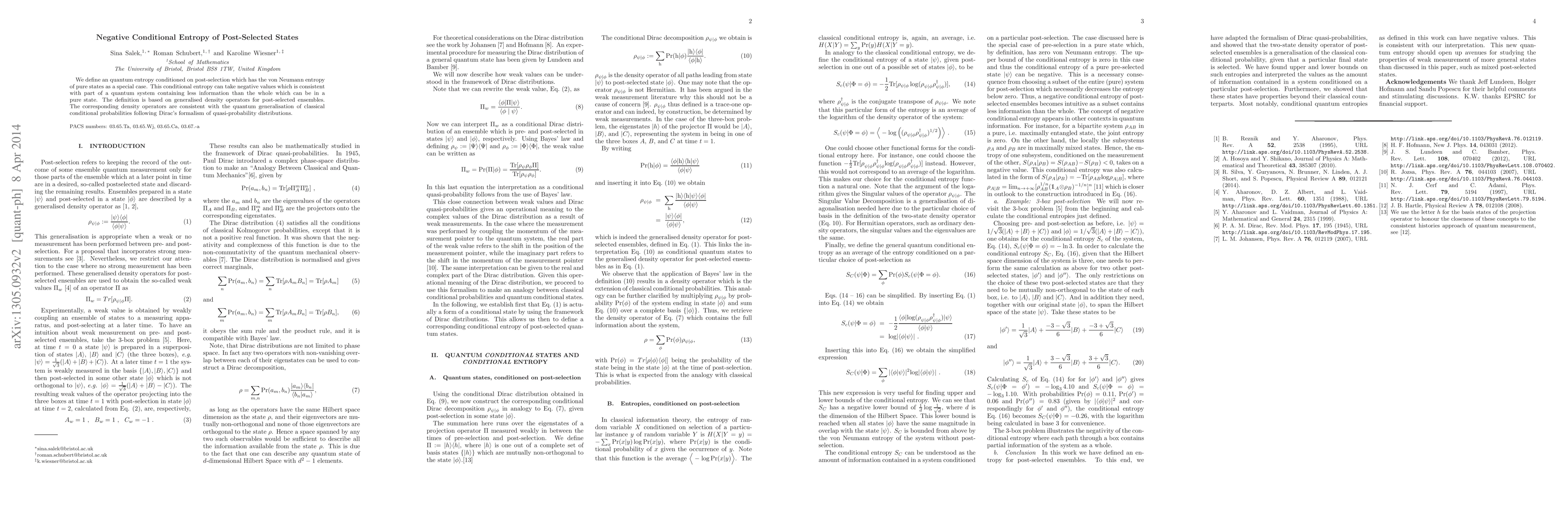 This paper introduces a novel quantum entropy conditioned on post-selection, which can yield negative values, illustrating that a subsystem may contain less information than the entire system, which can be in a pure state. The definition relies on generalized density operators for postselected ensembles and aligns with quantum generalizations of classical conditional probabilities.