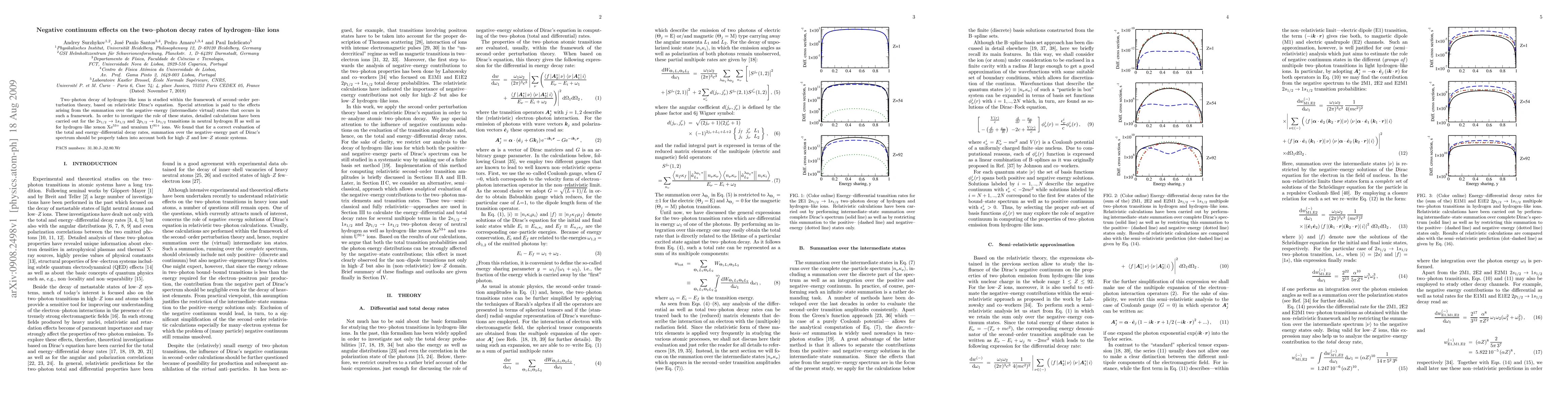 Two--photon decay of hydrogen--like ions is studied within the framework of second--order perturbation theory, based on relativistic Dirac's equation. Special attention is paid to the effects arising from the summation over the negative--energy (intermediate virtual) states that occurs in such a framework. In order to investigate the role of these states, detailed calculations have been carried out for the $2s_{1/2} - 1s_{1/2}$ and $2p_{1/2} - 1s_{1/2}$ transitions in neutral hydrogen H as well as for hydrogen--like xenon Xe$^{53+}$ and uranium U$^{91+}$ ions. We found that for a correct evaluation of the total and energy--differential decay rates, summation over the negative--energy part of Dirac's spectrum should be properly taken into account both for high--$Z$ and low--$Z$ atomic systems.