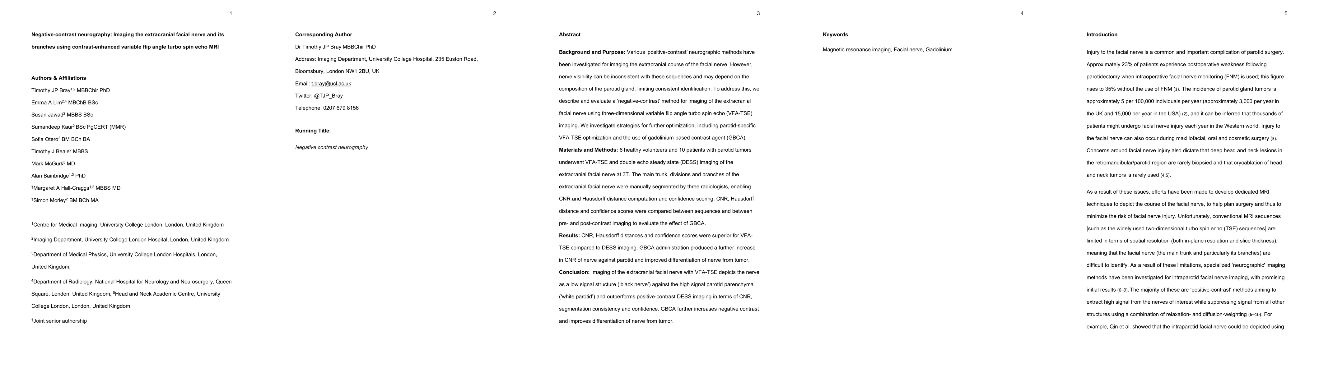 Background and Purpose: Various 'positive-contrast' neurographic methods have been investigated for imaging the extracranial course of the facial nerve. However, nerve visibility can be inconsistent with these sequences and may depend on the composition of the parotid gland, limiting consistent identification. To address this, we describe and evaluate a 'negative-contrast' method for imaging of the extracranial facial nerve using three-dimensional variable flip angle turbo spin echo (VFA-TSE) imaging. We investigate strategies for further optimization, including parotid-specific VFA-TSE optimization and the use of gadolinium-based contrast agent (GBCA). Materials and Methods: 6 healthy volunteers and 10 patients with parotid tumors underwent VFA-TSE and double echo steady state (DESS) imaging of the extracranial facial nerve at 3T. The main trunk, divisions and branches of the extracranial facial nerve were manually segmented by three radiologists, enabling CNR and Hausdorff distance computation and confidence scoring. CNR, Hausdorff distance and confidence scores were compared between sequences and between pre- and post-contrast imaging to evaluate the effect of GBCA. Results: CNR, Hausdorff distances and confidence scores were superior for VFA-TSE compared to DESS imaging. GBCA administration produced a further increase in CNR of nerve against parotid and improved differentiation of nerve from tumor. Conclusion: Imaging of the extracranial facial nerve with VFA-TSE depicts the nerve as a low signal structure ('black nerve') against the high signal parotid parenchyma ('white parotid') and outperforms positive-contrast DESS imaging in terms of CNR, segmentation consistency and confidence. GBCA further increases negative contrast and improves differentiation of nerve from tumor.