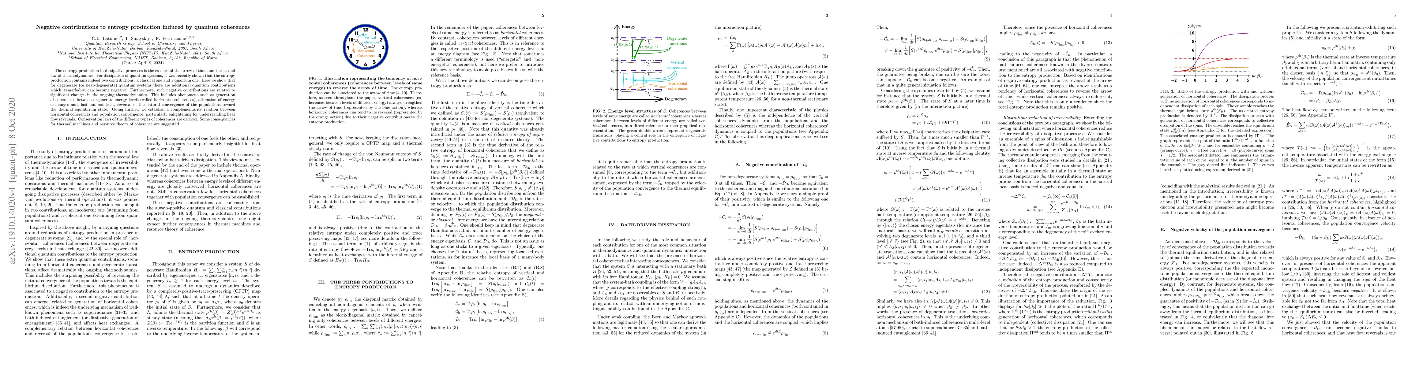 The entropy production in dissipative processes is the essence of the arrow of time and the second law of thermodynamics. For dissipation of quantum systems, it was recently shown that the entropy production contains indeed two contributions: a classical one and a quantum one. Here we show that for degenerate (or near-degenerate) quantum systems there are additional quantum contributions which, remarkably, can become negative. Furthermore, such negative contributions are related to significant changes in the ongoing thermodynamics. This includes phenomena such as generation of coherences between degenerate energy levels (called horizontal coherences), alteration of energy exchanges and, last but not least, reversal of the natural convergence of the populations toward the thermal equilibrium state. Going further, we establish a complementarity relation between horizontal coherences and population convergence, particularly enlightening for understanding heat flow reversals. Conservation laws of the different types of coherences are derived. Some consequences for thermal machines and resource theory of coherence are suggested.
